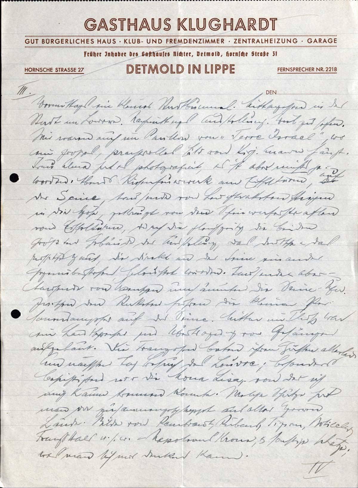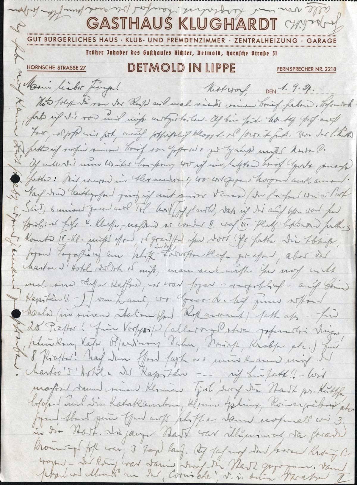 Nun sollst Du von der Reise aus mal wieder einen Brief haben. Besondres habe ich Dir von uns nicht mitzuteilen. Ich bin seit Montag früh auf Tour, es geht mir gut, auch geschäftlich klappt es soweit gut. Von der l. Mutter hatte ich vorhin einen Brief von gestern: zu Hause nichts Neues.