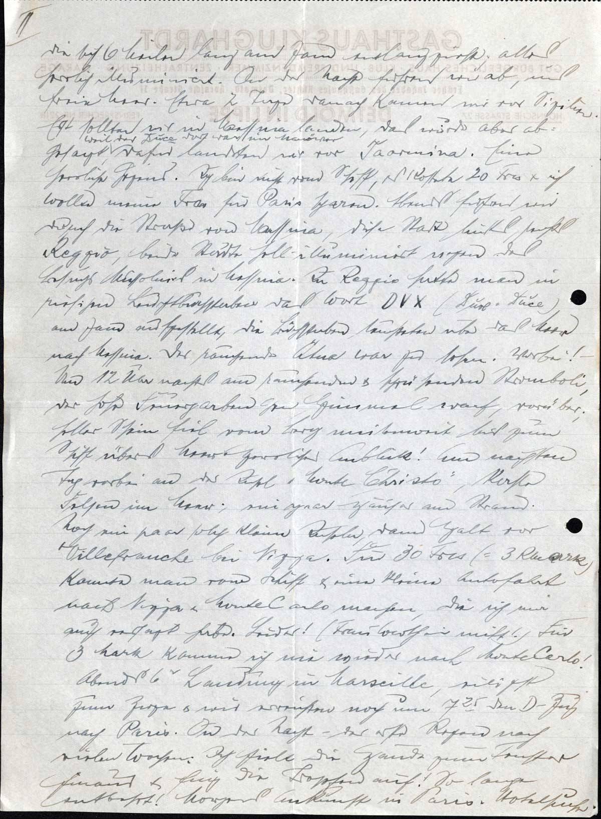 die sich 6 Meilen lang am [..] entlang zieht; alles herrlich illuminiert. In der Nacht furhen wir ab, ins freie Meer. Etwa 2 Tage danach kamen wir vor Sizilien. Erst sollten wir in Messina landen, das wurde aber abgesagt, weil der Duce dort war im Manöver, dafür landeten wir vor Taormina. Eien herrliche Gegend. Ich bin nicht vom Schiff, es kostete 20 Frcs & ich wollte meine Frcs für Paris sparen. Abends fuhren wir durch die Straße von Messina, diese Stadt links, rechts Reggio, beide Städte hell illuminiert wegen des Besuchs Mussolinis in Messina. In Reggio hatte man in riesigen Leuchtbuchstaben das Wort DVX (Duce - Duce) am [..] aufgestellt, die Buchstaben leuchteten über das Meer nach Messina. Der rauchende Ätna war zu sehen. Vorbei! - Um 12 Uhr nachts am rauchenden & sprühenden Stromboli, der hohe Feuergarben gen Himmel warf, vorüber; heller Schein fiel vom Berg meilenweit bis zum Schiff übers Meer - herrlicher Anblick! Am nächsten Tag vorbei an der Insel „Monte Christo”, kahle Felsen im Meer; ein paar Häuser am Strand. Noch ein paar solche kleine Inseln, dann Halt vor Villefranche bei Nizza. Für 30 Frcs (= 2 Rmark) konnte man vom Schiff & eine kleine Autofahrt nach Nizza & Monte Carlo machen, die ich mir auch versagt habe. Leider! (Frau Wertheim nicht!) Für 3 Mark komme ich nie wieder nach Monte Carlo! Abends 6 h Landung in Marseille, eiligst zum Zuge & wir erreichten noch um 7.25 den D-Zug nach Paris. In der Nacht - der erste Regen nach vielen Wochen. Ich hielt die Hände zum Fenster hinaus & fing die Tropfen auf! So lange entbehrt! Morgens Ankunft in Paris. Hotelsuche.