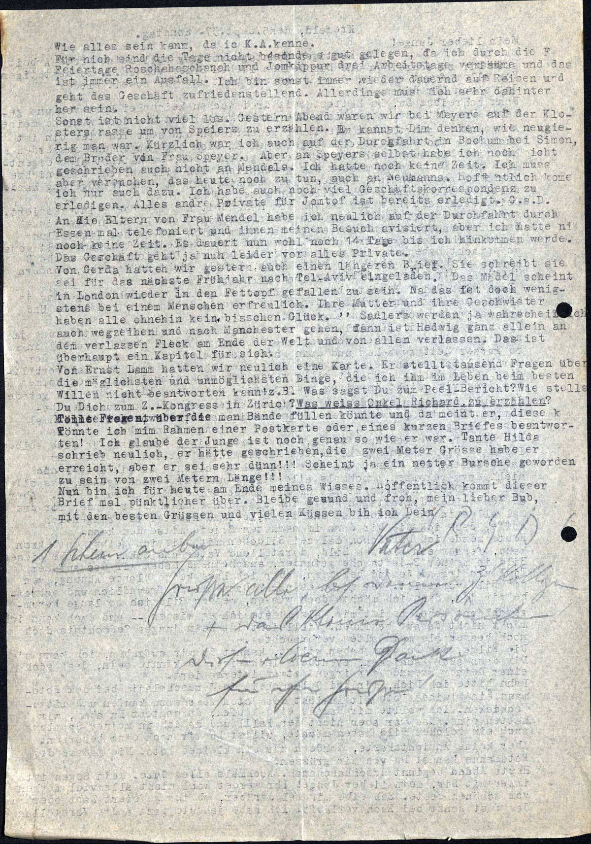 Von Ernst Lamm hatten wir neulich eine Karte. Er stellt tausend Fragen über die möglichsten und unmöglichsten Dinge, die ich ihm im Leben beim besten Willen nicht beantworten kann! z. B. Was sagst Du zum Peel-Bericht? Wie stellst Du Dich zum Z.-Kongress in Zürich? Was weiss Onkel Richard zu erzählen? Tolle Fragen, über die man Bände füllen könnte und da meint er, diese könnte ich im Rahmen einer Postkarte oder eines kurzen Briefes beantworten! Ich glaube der Junge ist noch genau so wie er war. Tante Hilda schrieb neulich, er hätte geschrieben, die zwei Meter Grösse habe er erreicht, aber er sei sehr dünn!!! Scheint ja ein netter Bursche geworden zu sein von zwei Metern Länge!!!