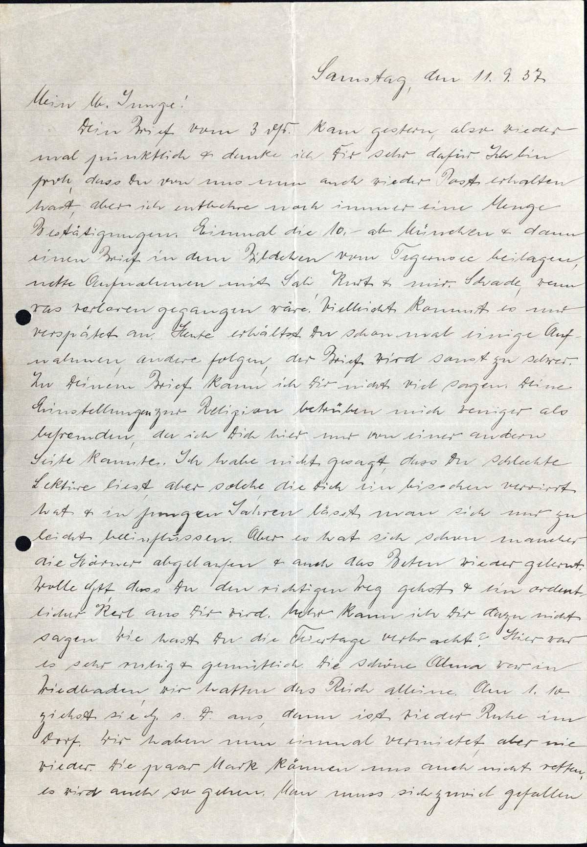 Dein Brief vom 3 ds. kam gestern, also wieder mal pünktlich & danke ich Dir sehr dafür. Ich bin froh, dass Du von uns nun auch wieder Post erhalten hast, aber ich entbehre noch immer eine Menge Bestätigungen. Einmal die 10,- ab München & dann einen Brief in dem Bildchen vom Tegernsee beilagen, nette Aufnahmen mit Sali, Kurt & mir. Schade, wenn was verloren gegangen wäre. Vielleicht kommt es nur verspätet an. Heute erhältst Du schon mal einige Aufnahmen, andere folgen, der Brief wird sonst zu schwer. Zu Deinem Brief kann ich Dir nicht viel sagen. Deine Einstellungen zur Religion betrüben mich weniger als befremden, da ich Dich hier nur von einer andern Seite kannte. Ich habe nicht gesagt, dass Du schlechte Lektüre liest, aber solche, die Dich ein bisschen verwirrt hat & in jungen Jahren lässt man sich nur zu leicht beeinflussen. Aber es hat sich schon mancher die Hörner abgelaufen & auch das Beten wieder gelernt. Wolle Gtt, dass Du den richtigen Weg gehst & ein ordentlicher Kerl aus Dir wird. Mehr kann ich Dir dazu nicht sagen. Wie hast Du die Feiertage verbracht? Hier war es sehr ruhig & gemütlich. Die schöne Alma war in Wiesbaden, wir hatten das Reich alleine. Am 1.10. ziehst sie G. s. D. aus, dann ist wieder Ruhe im Dorf. Wir haben nun einmal vermietet, aber nie wieder. Die paar Mark können uns auch nicht retten, es wird auch so gehen. Man muss sich zuviel gefallen