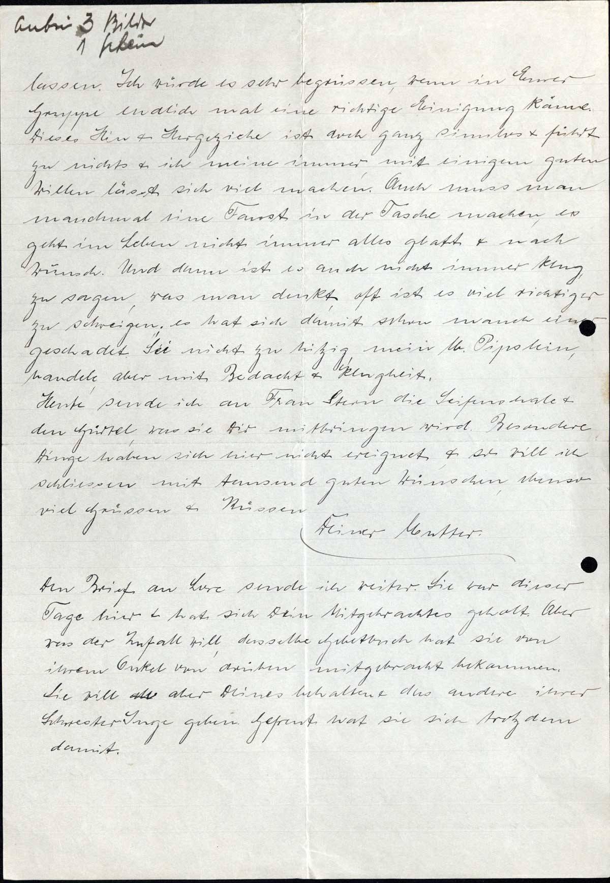 Heute sende ich an Frau Stern die Seifenschale & den Gürtel, was sie Dir mitbringen wird. Besondere Dinge haben sich hier nicht ereignet & so will ich schliessen mit tausend guten Wünschen, ebenso viel Grüssen & Küssen