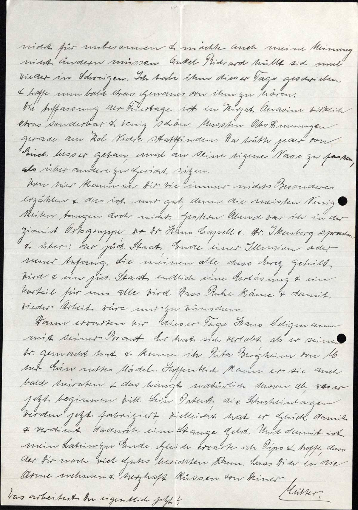 Dann erwarten wir dieser Tage Hans Seligmann mit seiner Braut. Er hat sich verlobt, als er seinen Dr. gemacht hat & kenne ich Rita Bergheim von M. her. Ein nettes Mädel. Hoffentlich kann er sie auch bald heiraten & das hängt natürlich davon ab, was er jetzt beginnen will. Sein Patent, die Schuheinlagen werden jetzt fabriziert, vielleicht hat er Glück damit & verdient dadurch eine Stange Geld. Und damit ist mein Latein zu Ende. Gleich erwarte ich Pips & hoffe, dass der Dir noch viel Gutes berichten kann. Lass Dich in die Arme nehmen & herzhaft küssen von Deiner