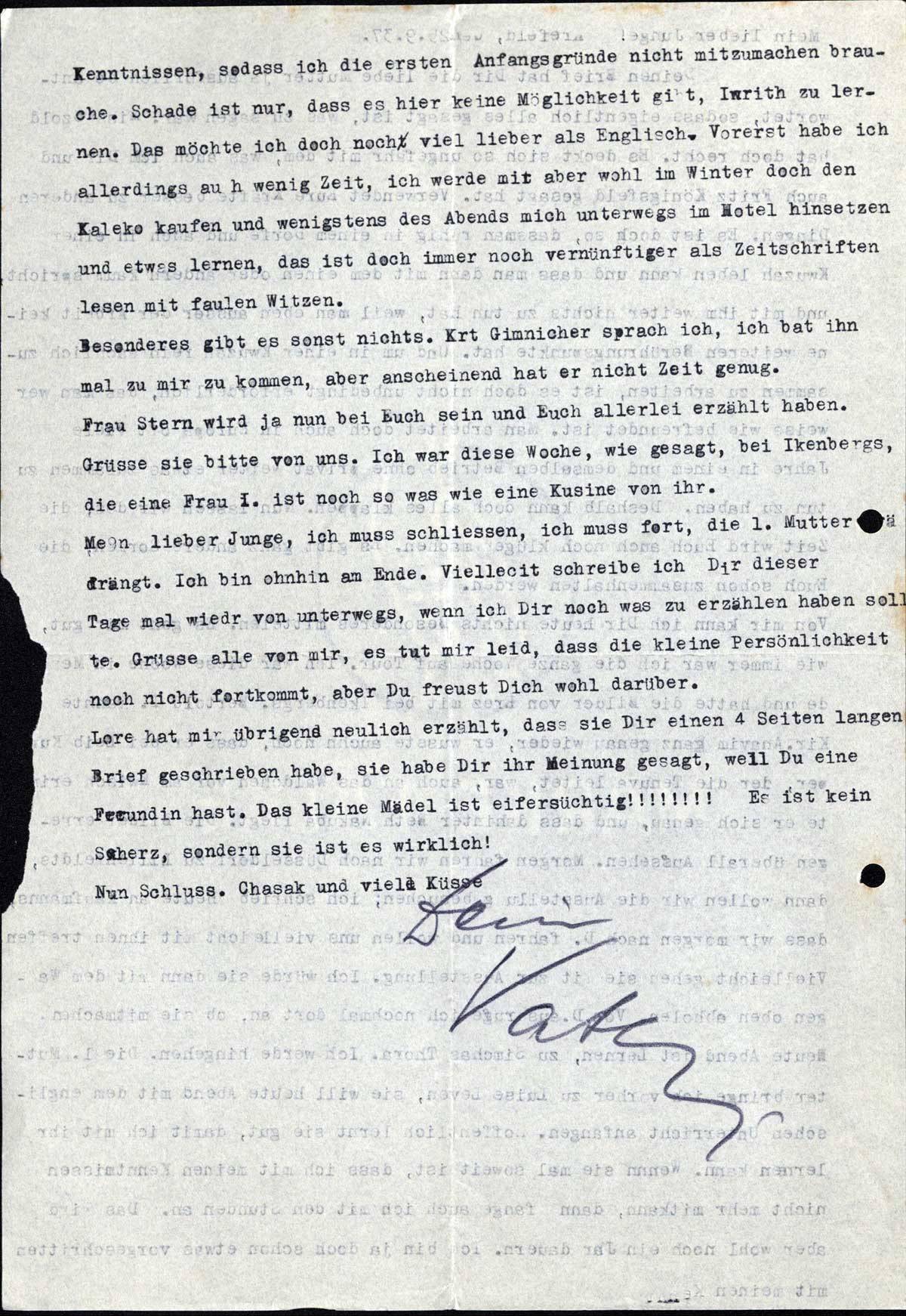 Deinen Brief hat Dir die liebe Mutter ja ausführlich beantwortet, sodass eigentlich alles gesagt ist, was zu sagen war. Miss Szold hat doch recht. Es deckt sich so ungefähr mit dem, was auch ich Dir und auch Fritz Königsfeld gesagt hat. Verwendet Eure Kräfte besser zu anderen Dingen. Es ist doch so, dass man ruhig in einem Dorfe und auch in einer Kwuzah leben kann und dass man dann mit dem einen oder andern kaum spricht, und mit ihm weiter nichts zu tun hat, weil man eben ausser der Arbeit keine weiteren Berührungspunkte hat. Und um in einer Kwuzah rein sachlich zusammen zu arbeiten, ist es doch nicht unbedingt erforderlich, das man wer weiss wie befreundet ist. Man arbeitet doch auch in Europa oft viele Jahre in einem und demselben Betrieb ohne privat weiter etwas zusammen zu tun zu haben. Deshalb kann doch alles klappen. Nun lassen wir das, die Zeit wird Euch auch noch klüger machen. Es gibt ganz andere Sorgen, die Euch schon zusammenhalten werden.