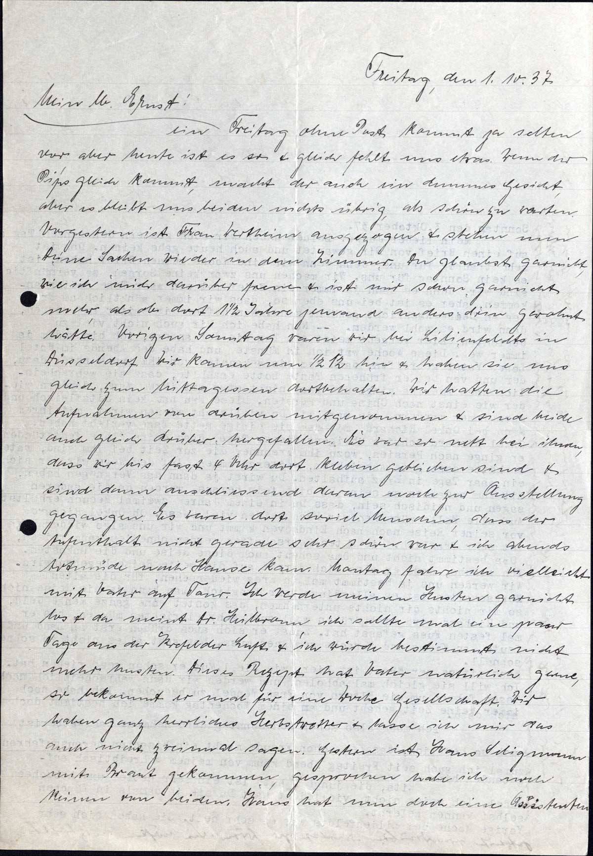ein Freitag ohne Post kommt ja selten vor, aber heute ist es so & gleich fehlt uns etwas. Wenn der Pips gleich kommt, macht der auch ein dummes Gesicht, aber es bleibt uns beiden nichts übrig, als schön zu warten. Vorgestern ist Frau Wertheim ausgezogen & stehen nun Deine Sachen wieder in dem Zimmer. Du glaubst garnicht, wie ich mich darüber freue & ist mir schon garnicht mehr, als ob dort 1 ½ Jahre jemand anders drin gewohnt hätte. Vorigen Sonntag waren wir bei Lilienfeldts in Düsseldorf. Wir kam um ½ 12 hin & haben sie uns gleich zum Mittagessen dortbehalten. Wir hatten die Aufnahmen von drüben mitgenommen & sind beide auch gleich darüber hergefallen. Es war so nett bei ihnen, dass wir bis fast 4 Uhr dort kleben geblieben sind & sind dann anschliessend daran noch zur Ausstellung gegangen. Es waren dort soviel Menschen, dass der Aufenthalt nicht gerade sehr schön war & ich abends totmüde nach Hause kam. Montag fahre ich vielleicht mit Vater auf Tour. Ich werde meinen Husten garnicht los & da meint Dr. Heilbronn, ich sollte mal ein paar Tage aus der Krefelder Luft & ich würde bestimmt nicht mehr husten. Dieses Rezept hat Vater natürlich gerne, so bekommt er mal für eine Woche Gesellschaft. Wir haben ganz herrliches Herbstwetter & lasse ich mir das auch nicht zweimal sagen. Gestern ist Hans Seligmann mit Braut gekommen, gesprochen habe ich noch keinen von beiden. Hans hat nun doch eine Assistenten-