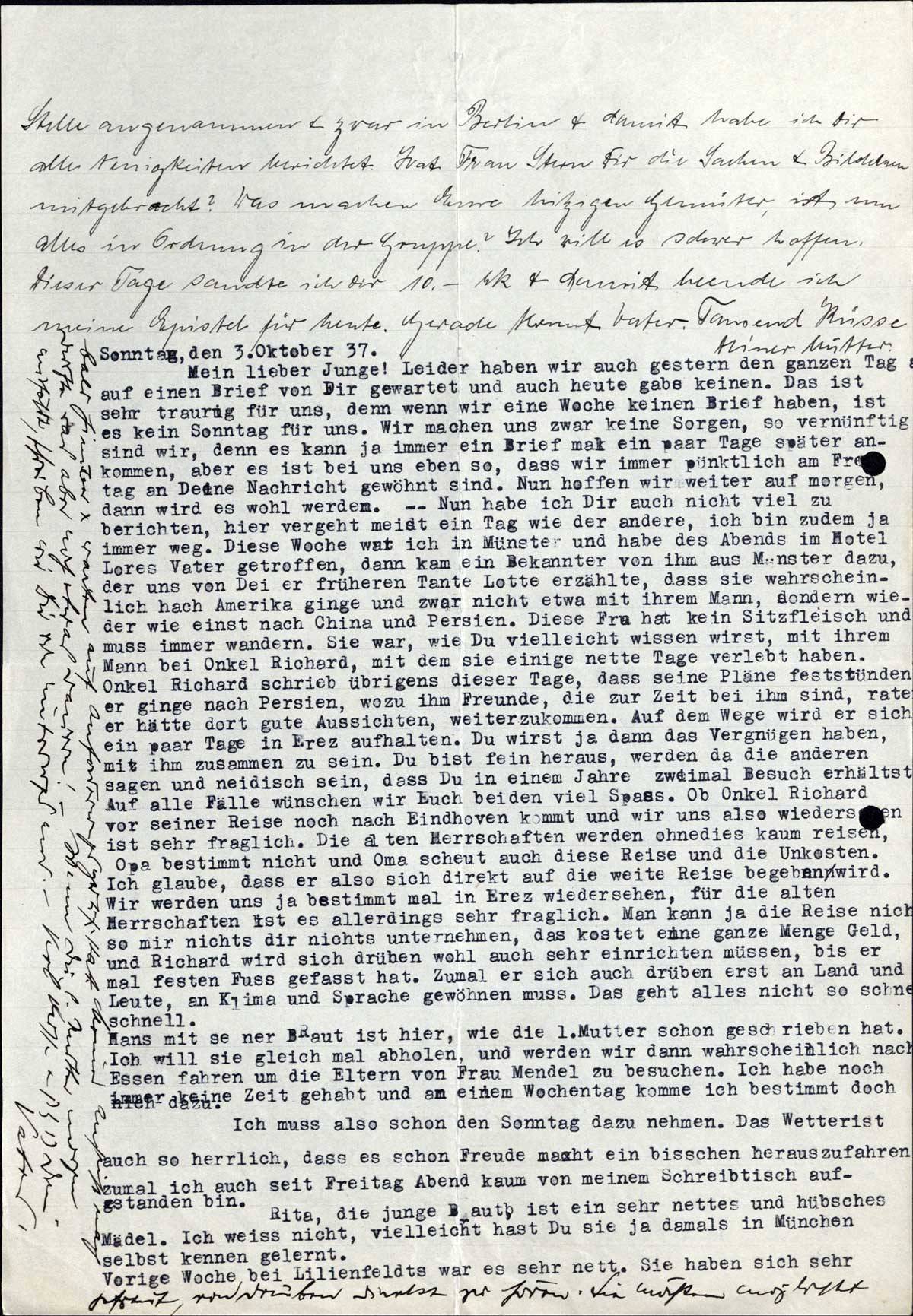 Mein lieber Junge! Leider haben wir auch gestern den ganzen Tag auf einen Brief von Dir gewartet und auch heute gabs keinen. Das ist sehr traurig für uns, denn wenn wir eine Woche keinen Brief haben, ist es kein Sonntag für uns. Wir machen uns zwar keine Sorgen, so vernünftig sind wir, denn es kann ja immer ein Brief mal ein paar Tage später ankommen, aber es ist bei uns eben so, dass wir immer pünktlich am Freitag an Deine Nachricht gewöhnt sind. Nun hoffen wir weiter auf morgen, dann wird es wohl werden. - - Nun habe ich Dir auch nicht viel zu berichten, hier vergeht meist ein Tag wie der andere, ich bin zudem ja immer weg. Diese Woche war ich in Münster und habe des Abends im Hotel Lores Vater getroffen, dann kam ein Bekannter von ihm aus Münster dazu, der uns von Deiner früheren Tante Lotte erzählte, dass sie wahrscheinlich nach Amerika ginge und zwar nicht etwa mit ihrem Mann, sondern wieder wie einst nach China und Persien. Diese Frau hat kein Sitzfleisch und muss immer wandern. Sie war, wie Du vielleicht wissen wirst, mit ihrem Mann bei Onkel Richard, mit dem sie einige nette Tage verlebt haben. Onkel Richard schrieb übrigens dieser Tage, dass seine Pläne feststünden, er ginge nach Persien, wozu ihm Freunde,. die zur Zeit bei ihm sind, raten, er hätte dort gute Aussichten, weiterzukommen. Auf dem Wege wird er sich ein paar Tage in Erez aufhalten. Du wirst ja dann das Vergnügen haben, mit ihm zusammen zu sein. Du bist fein heraus, werden da die anderen sagen und neidisch sein, dass Du in einem Jahre zweimal Besuch erhältst. Auf alle Fälle wünschen wir Euch beiden viel Spass. Ob Onkel Richard vor seiner Reise noch nach Eindhoven kommt und wir uns also wiedersehen ist sehr fraglich. Die alten Herrschaften werden ohnedies kaum reisen, Opa bestimmt nicht und Oma scheut auch diese Reisen und die Unkosten. Ich glaube, dass er also sich direkt auf die weite Reise begeben wird. Wir werden uns ja bestimmt mal in Erez wiedersehen, für die alten Herrschaften ist es allerdings sehr fraglich. Man kann ja die Reise nicht so mir nichts dir nichts unternehmen, das kostet eine ganze Menge Geld, und Richard wird sich drüben wohl auch sehr einrichten müssen, bis er mal festen Fuss gefasst hat. Zumal er sich auch drüben erst an Land und Leute, an Klima und Sprache gewöhnen muss. Das geht alles nicht so schnell.