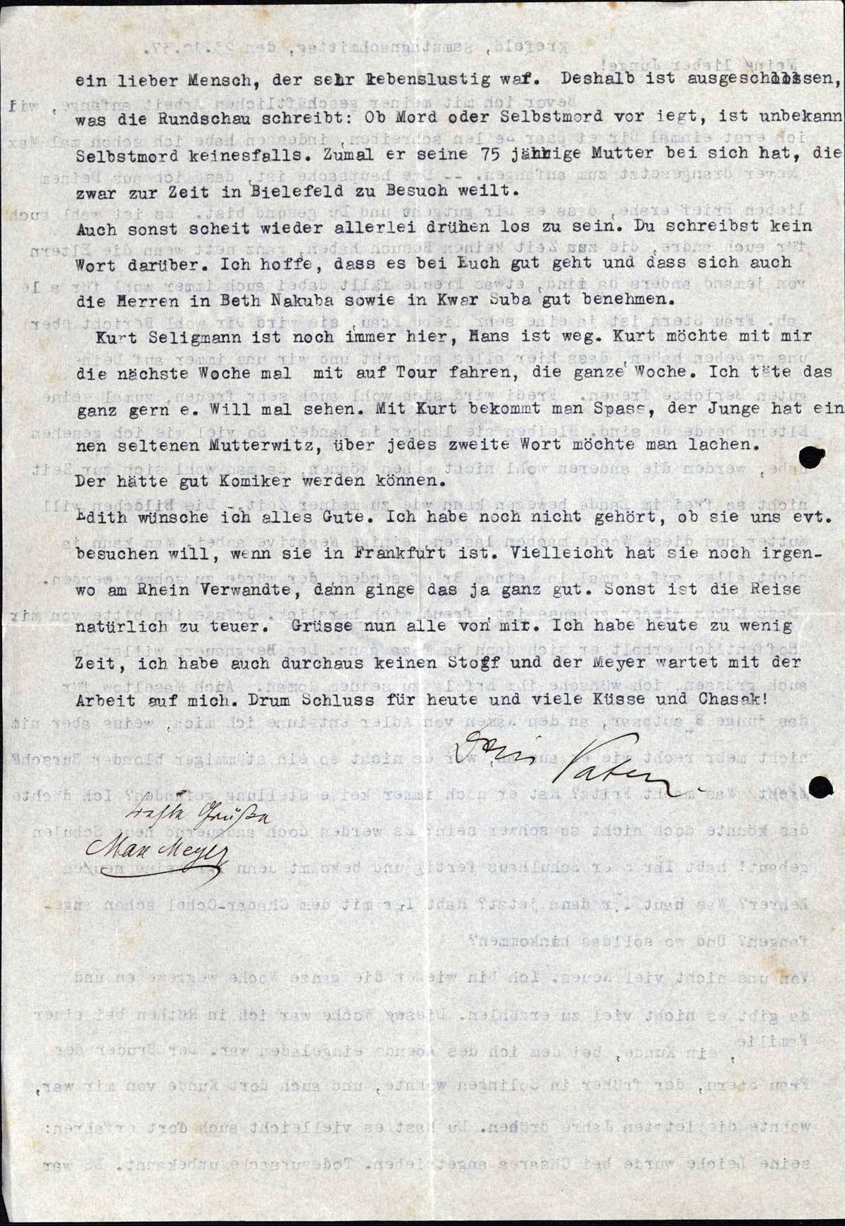 Edith wünsche ich alles Gute. Ich habe noch nicht gehört, ob sie uns evt. besuchen will, wenn sie in Frankfurt ist. Vielleicht hat sie noch irgendwo am Rhein Verwandte, dann ginge das ja ganz gut. Sonst ist die Reise natürlich zu teuer. Grüsse nun alle von mir. Ich habe heute ein wenig Zeit, ich habe auch durchaus keinen Stoff und der Meyer wartet mit der Arbeit auf mich. Drum Schluss für heute und viele Küsse und Chasak!