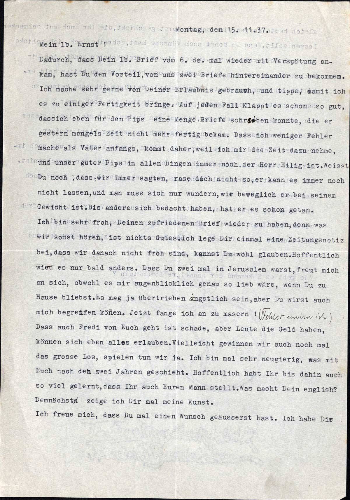 Erna Loewy an Sohn Ernst, 15. November 1937