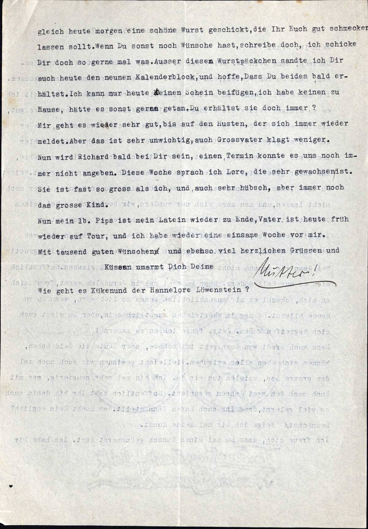 Mir geht es wieder sehr gut, bis auf den Husten, der sich immer wieder meldet. Aber das ist sehr unwichtig, auch Grossvater klagt weniger. Nun wird Richard bald bei Dir sein, einen Termin konnte er uns noch immer nicht angeben. Diese Woche sprach ich Lore, die sehr gewachsen ist. Sie ist fast so gross als ich, und auch sehr hübsch, aber immer noch das grosse Kind.