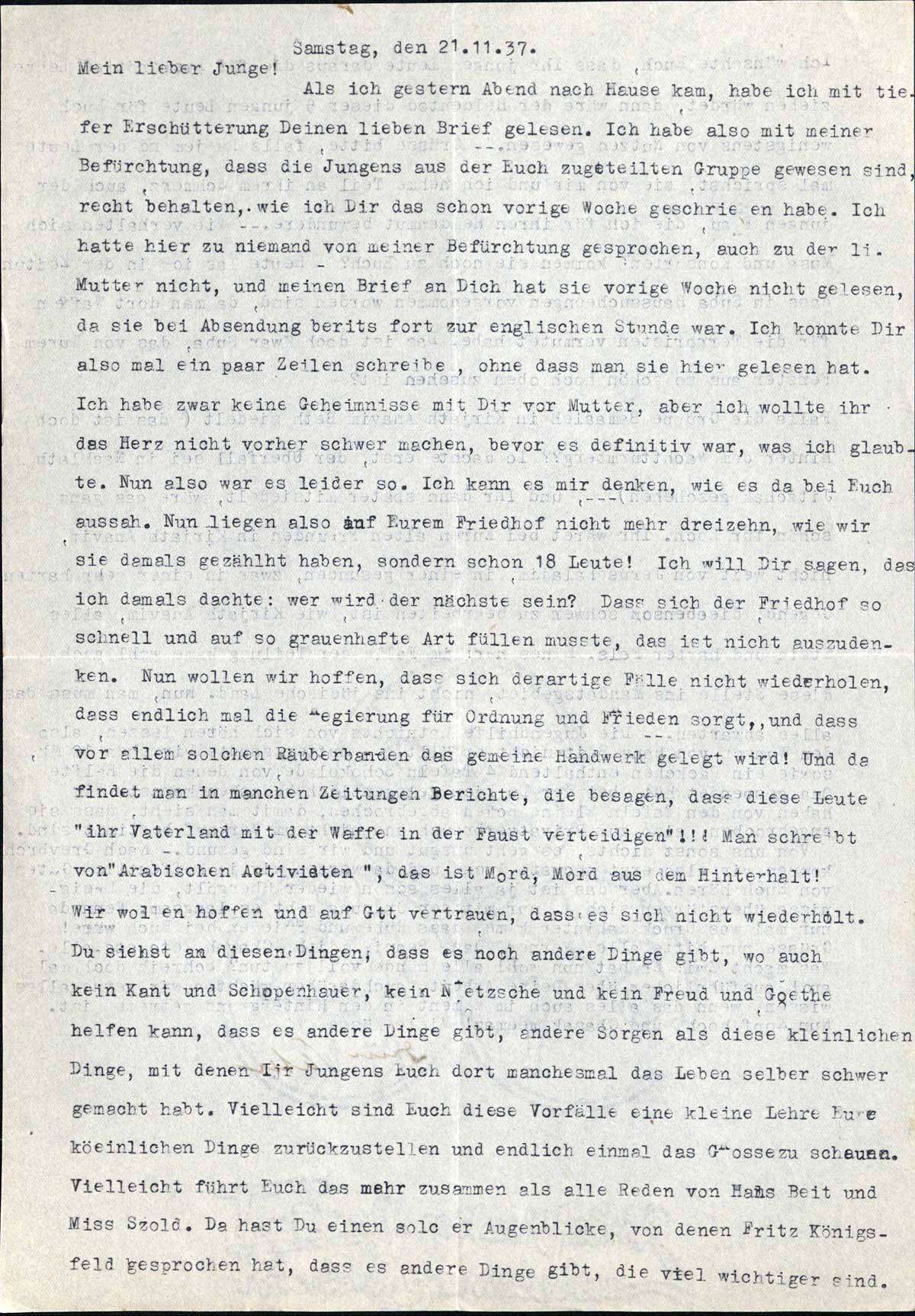 Als ich gestern Abend nach Hause kam, habe ich mit tiefer Erschütterung Deinen lieben Brief gelesen. Ich habe also mit meiner Befürchtung, dass die Jungens aus der Euch zugeteilten Gruppe gewesen sind, recht behalten, wie ich Dir das schon vorige Woche geschrieben habe. Ich hatte hier zu niemand von meiner Befürchtung gesprochen, auch zu der li. Mutter nicht, und meinen Brief an Dich hat sie vorige Woche nicht gelesen, da sie bei Absendung bereits fort zur englischen Stunde war. Ich konnte Dir also mal ein paar Zeilen schreiben, ohne dass man sie hier gelesen hat. Ich habe zwar keine Geheimnisse mit Dir vor Mutter, aber ich wollte ihr das Herz nicht vorher schwer machen, bevor es definitiv war, was ich glaubte. Nun also war es leider so. Ich kann es mir denken, wie es da bei Euch aussah. Nun liegen also auf Eurem Friedhof nicht mehr dreizehn, wie wir sie damals gezählt haben, sondern schon 18 Leute! Ich will Dir sagen, dass ich damals dachte: wer wird der nächste sein? Dass sich der Friedhof so schnell und auf so grauenhafte Art füllen musste, das ist nicht auszudenken. Nun wollen wir hoffen, dass sich derartige Fälle nicht wiederholen, dass endlich mal die Regierung für Ordnung und Frieden sorgt, und dass vor allem solchen Räuberbanden das gemeine Handwerk gelegt wird! Und da findet man in manchen Zeitungen Berichte, die besagen, dass diese Leute „ihr Vaterland mit der Waffe in der Faust verteidigen”!!! Man schreibt von „Arabischen Activisten”, das ist Mord, Mord aus dem Hinterhalt!
