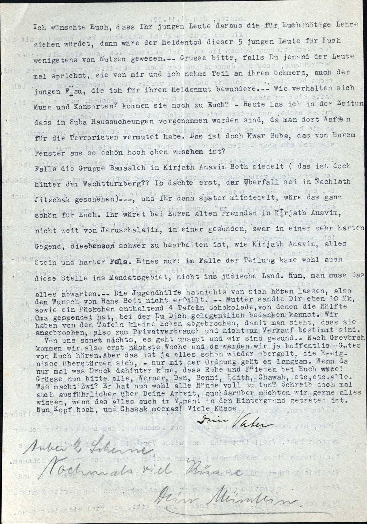 Falls die Gruppe Bamaaleh in Kirjath Anavim Beth siedelt (das ist doch hinter dem Wachtturmberg?? Ich dachte erst, der Überfall sei in Nachlath Jitzchak geschehen) - - -, und Ihr dann später mitsiedelt, wäre das ganz schön für Euch. Ihr wäret bei Euren alten Freunden in Kirjath Anavim, nicht weit von Jeruschalajim, in einer gesunden, zwar in einer sehr harten Gegend, die ebenso schwer zu bearbeiten ist, wie Kirjath Anavim, alles Stein und harter Fels. Eines nur: im Falle der Teilung käme wohl auch diese Stelle ins Mandatsgebiet, nicht ins jüdische Land. Nun, man muss das alles abwarten. - - Die Jugendhilfe hat nichts von sich hören lassen, also den Wunsch von Hans Beit nicht erfüllt. - - Mutter sandte Dir eben 10 Mk, sowie ein Päckchen enthaltend 4 Tafeln Schokolade, von denen die Hälfte Oma gespendet hat, bei der Du Dich gelegentlich bedanken kannst. Wir haben von den Tafeln kleine Ecken abgebrochen, damit man sieht, dass sie angebrochen, also zum Privatverbrauch und nicht zum Verkauf bestimmt sind.