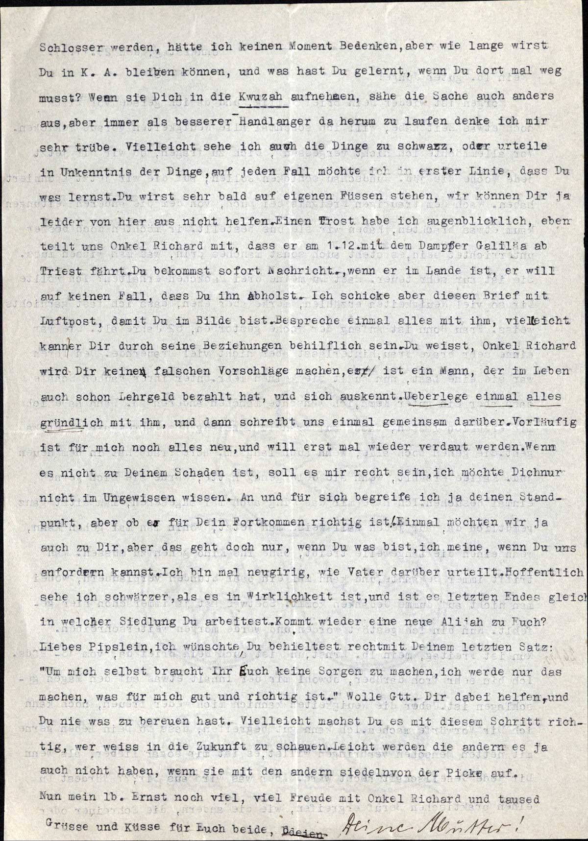 Schlosser werden, hätte ich keinen Moment Bedenken, aber wie lange wirst Du in K. A. bleiben können, und was hast Du gelernt, wenn Du dort mal weg musst? Wenn sie Dich in die Kwuzah aufnehmen, sähe die Sache auch anders aus, aber immer als besserer Handlanger da herum zu laufen denke ich mir sehr trübe. Vielleicht sehe ich auch die Dinge zu schwarz, oder urteile in Unkenntnis der Dinge, auf jeden Fall möchte ich in erster Linie, dass Du was lernst. Du wirst sehr bald auf eigenen Füssen stehen, wir können Dir ja leider von hier aus nicht helfen. Einen Trost habe ich augenblicklich, eben teilt uns Onkel Richard mit, dass er am 1.12. mit dem Dampfer Galiläa ab Triest fährt. Du bekommst sofort Nachricht, wenn er im Lande ist, er will auf keinen Fall, dass Du ihn abholst. Ich schicke aber diesen Brief mit Luftpost, damit Du im Bilde bist. Bespreche einmal alles mit ihm, vielleicht kann er Dir durch seine Beziehungen behilflich sein. Du weisst, Onkel Richard wird Dir keine falschen Vorschläge machen, er ist ein Mann, der im Leben auch schon Lehrgeld bezahlt hat, und sich auskennt. Ueberlege einmal alles gründlich mit ihm, und dann schreibt uns einmal gemeinsam darüber. Vorläufig ist für mich noch alles neu, und will erst mal wieder verdaut werden. Wenn es nicht zu Deinem Schaden ist, soll es mir recht sein, ich möchte Dich nur nicht im Ungewissen wissen. An und für sich begreife ich ja Deinen Standpunkt, aber ob es für Dein Fortkommen richtig ist! Einmal möchten wir ja auch zu Dir, aber das geht doch nur, wenn Du was bist, ich meine, wenn Du uns anfordern kannst. Ich bin mal neugierig, wie Vater darüber urteilt. Hoffentlich sehe ich schwärzer, als es in Wirklichkeit ist, und ist es letzten Endes gleich in welcher Siedlung Du arbeitest. Kommt wieder eine neue Alijah zu Euch?