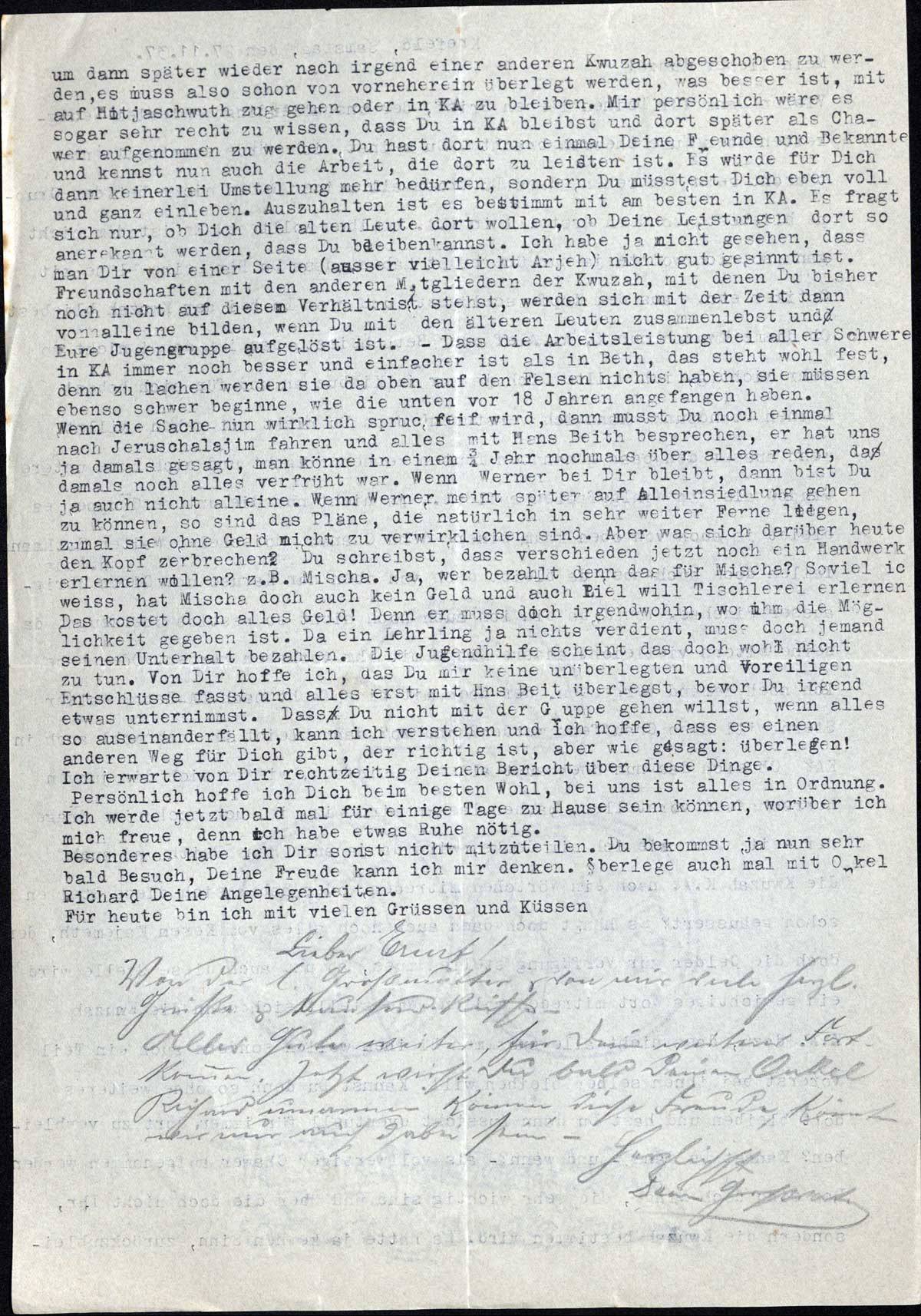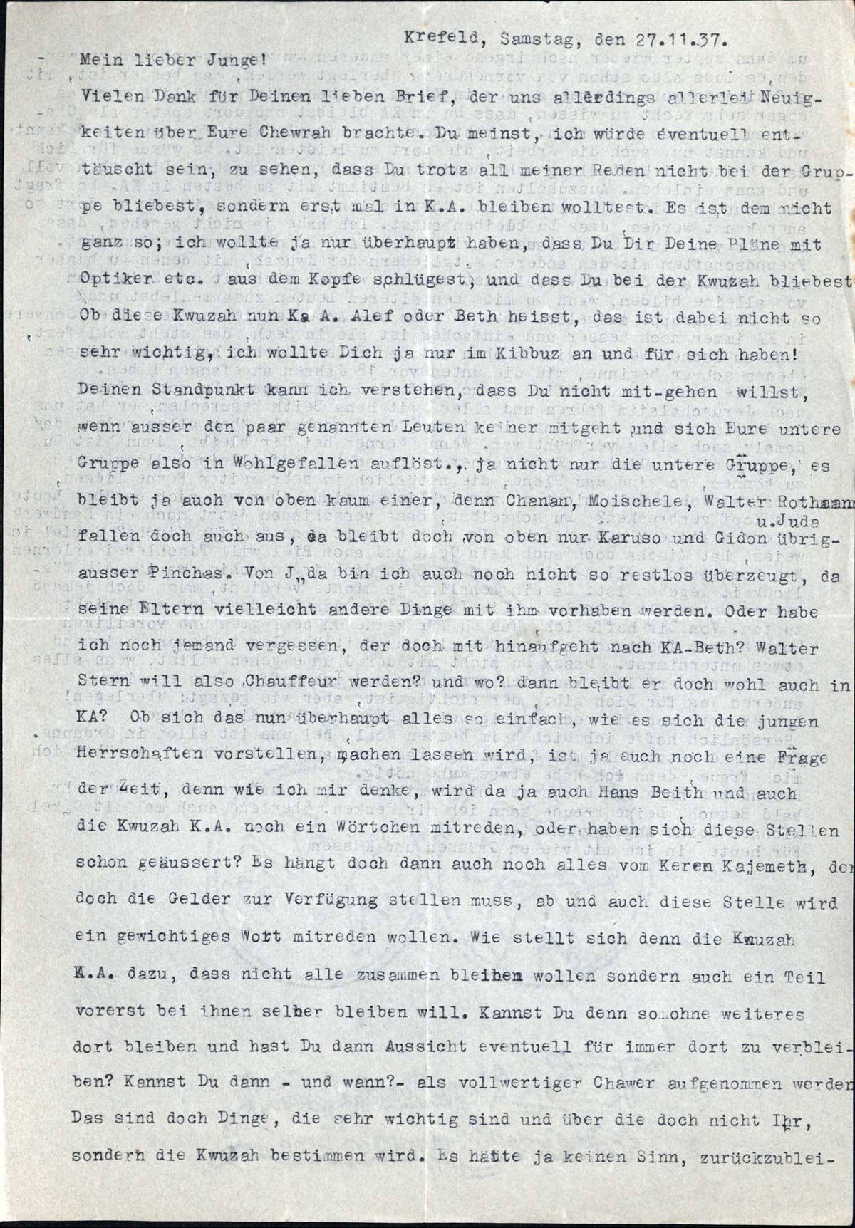 Vielen Dank für Deinen lieben Brief, der uns allerdings allerlei Neuigkeiten über Eure Chewrah brachte. Du meinst, ich würde eventuell enttäuscht sein, zu sehen, dass Du trotz all meiner Reden nicht bei Gruppe bliebest, sondern erst mal in K.A. bleiben wolltest. Es ist dem nicht ganz so; ich wollte ja nur überhaupt haben, dass Du Dir Deine Pläne mit Optiker etc. aus dem Kopfe schlügest, und dass Du bei der Kwuzah bliebest. Ob diese Kwuzah nun K. A. Alef oder Beth heisst, das ist dabei nicht so sehr wichtig, ich wollte Dich ja nur im Kibbuz an und für sich haben! Deinen Standpunkt kann ich verstehen, dass Du nicht mitgehen willst, wenn ausser den paar genannten Leuten keiner mitgeht und sich Eure untere Gruppe also in Wohlgefallen auflöst, ja nicht nur die untere Gruppe, es bleibt ja auch von oben kaum einer, denn Chanan, Moischele, Walter Rothmann fallen doch auch aus, da bleibt doch von oben nur Karuso und Gidon u. Juda übrig - ausser Pinchas. Von Juda bin ich auch noch nicht so restlos überzeugt, da seine Eltern vielleicht andere Dinge mit ihm vorhaben werden. Oder habe ich noch jemand vergessen, der doch mit hinaufgeht nach K.A.-Beth? Walter Stern will also Chauffeur werden? und wo? dann bleibt er doch wohl auch in KA? Ob sich das nun überhaupt alles so einfach, wie es sich die jungen Herrschaften vorstellen, machen lassen wird, ist ja auch noch eine Frage der Zeit, denn wie ich mir denke, wird da ja auch Hans Beith und auch die Kwuzah K. A. noch ein Wörtchen mitreden, oder haben sich diese Stellen schon geäussert? Es hängt doch dann auch noch alles vom Keren Kajemeth, der doch die Gelder zur Verfügung stellen muss, ab und auch diese Stelle wird ein gewichtiges Wort mitreden wollen. Wie stellt sich denn die Kwuzah K. A. dazu, dass nicht alle zusammen bleiben wollen sondern auch ein Teil vorerst bei ihnen selber bleiben will. Kannst Du denn so ohne weiteres dort bleiben und hast Du dann Aussicht eventuell für immer dort zu verbleiben? Kannst Du dann - und wann? - als vollwertiger Chawer aufgenommen werden? Das sind doch Dinge, die sehr wichtig sind und über die doch nicht Ihr, sondern die Kwuzah bestimmen wird. Es hätte ja keinen Sinn, zurückzublei-