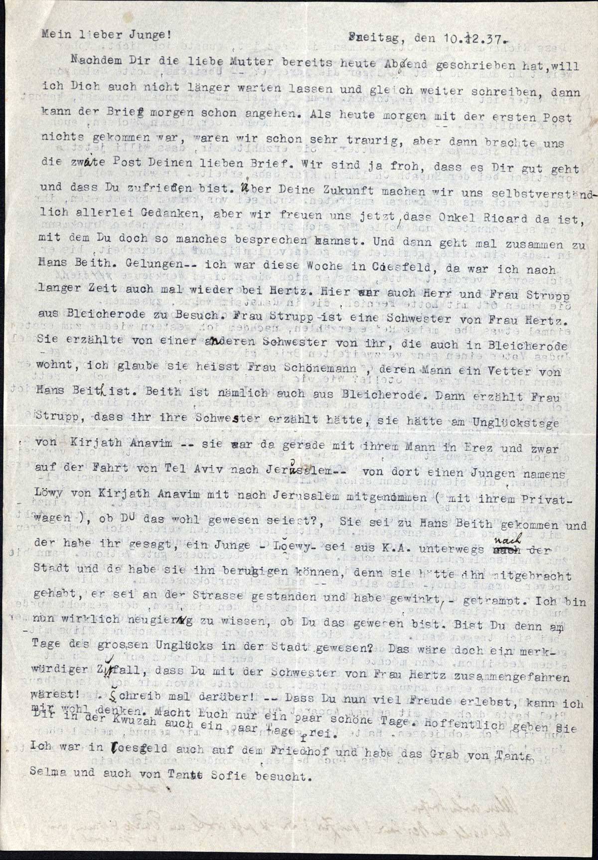 Nachdem Dir die liebe Mutter bereits heute Abend geschrieben hat, will ich Dich auch nicht länger warten lassen und gleich weiter schreiben, dann kann der Brief morgen schon angehen. Als heute morgen mit der ersten Post nichts gekommen war, waren wir schon sehr traurig, aber dann brachte uns die zweite Post Deinen lieben Brief. Wir sind ja froh, dass es Dir gut geht und dass Du zufrieden bist. Über Deine Zukunft machen wir uns selbstverständlich allerlei Gedanken, aber wir freuen uns jetzt, dass Onkel Richard da ist, mit dem Du doch so manches besprechen kannst. Und dann geht mal zusammen zu Hans Beith. Belungen - - ich war diese Woche in Coesfeld, da war ich nach langer Zeit auchmal wieder bei Hertz. Hier war auch Herr und Frau Strupp aus Bleicherode zu Besuch. Frau Strupp ist eine Schwester von Frau Hertz. Sie erzählte von einer anderen Schwester von ihr, die auch in Bleicherode wohnt, ich glaube sie heisst Frau Schönemann, deren Mann ein Vetter von Hans Beith ist. Beith ist nämlich auch aus Bleicherode. Dann erzählt Frau Strupp, dass ihr ihre Schwester erzählt hätte, sie hätte am Unglückstage von Kirjath Anavim - - sie war da gerade mit ihrem Mann in Erez und zwar auf der Fahrt von Tel Aviv nach Jerusalem - - von dort einen Jungen namens Löwy von Kirjath Anavim mit nach Jerusalem mitgenommen (mit ihrem Privatwagen), ob Du das wohl gewesen seiest? Sie sei zu Hans Beith gekommen und der habe ihr gesagt, ein Junge - Loewy - sei aus K. a. unterwegs nach der Stadt und da habe sie ihn beruhigen können, denn sie hätte ihn mitgebracht gehabt, er sei an der Strasse gestanden und habe gewinkt - getrampt. Ich bin nun wirklich neugierig zu wissen, ob Du das gewesen bist. Bist Du denn am Tage des grossen Unglücks in der Stadt gewesen? Das wäre doch ein merkwürdiger Zufall, dass Du mit der Schwester von Frau Hertz zusammengefahren wärest! Schreib mal darüber! - - Dass Du nun viel Freude erlebst, kann ich mir wohl denken. Macht Euch nur ein paar schöne Tage. Hoffentlich geben sie Dir in der Kwuzah auch ein paar Tage frei.