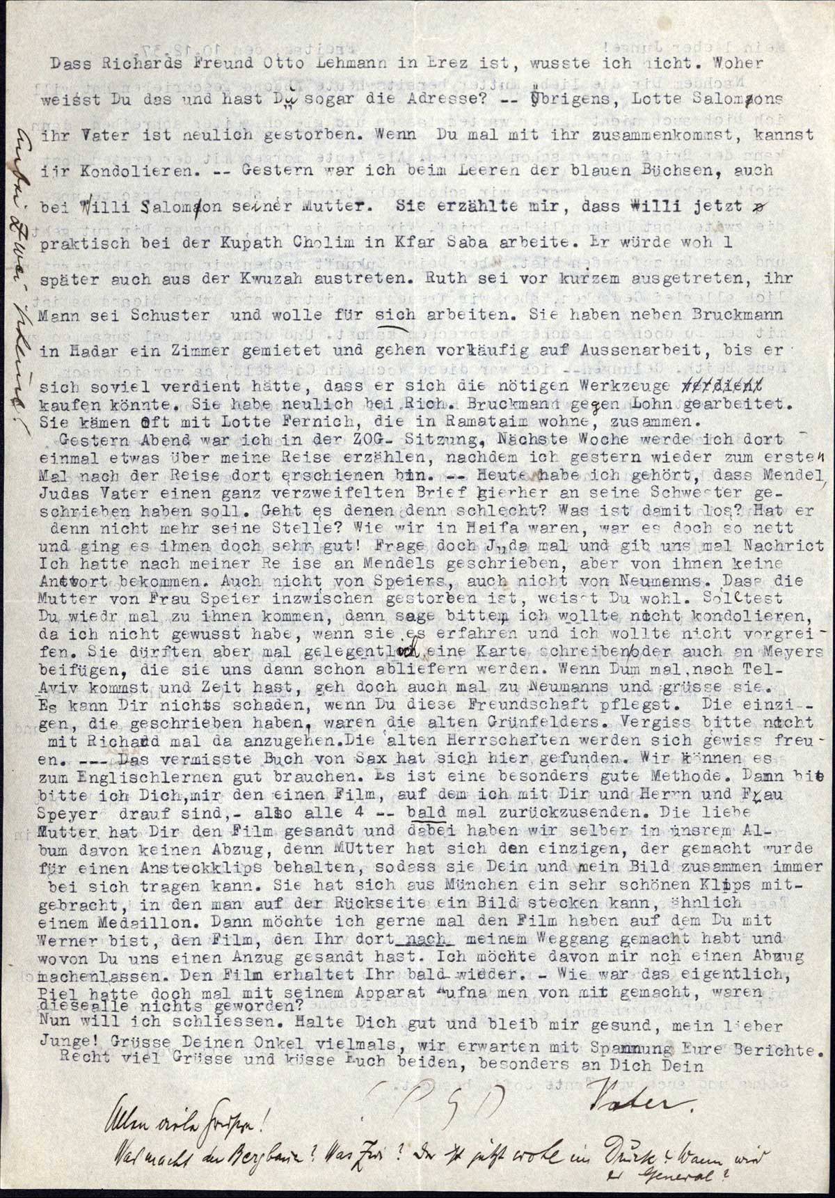 Dass Richards Freund Otto Lehmann in Erez ist, wusste ich nicht. Woher weisst Du das und hast Du sogar die Adresse? - - Übrigens, Lotte Salomons ihr Vater ist neulich gestorben. Wenn Du mal mit ihr zusammenkommst, kannst ihr kondolieren. - - Gestern war ich beim Leeren der blauen Büchsen, auch bei Willi Salomon seiner Mutter. Sie erzählte mir, dass Willi jetzt praktisch bei der Kupath Cholim in Kfar Saba arbeite. Er würde wohl später auch aus der Kwuzah austreten. Ruth sei vor kurzem ausgetreten, ihr Mann sei Schuster und wolle für sich arbeiten. Sie haben neben Bruckmann in Hadar ein Zimmer gemietet und gehen vorläufig auf Aussenarbeit, bis er sich soviel verdient hätte, dass er sich die nötigen Werkzeuge kaufen könnte. Sie habe neulich bei Rich. Bruckmann gegen Lohn gearbeitet. Sie kämen oft mit Lotte Fernich, die in Ramataim wohne, zusammen.