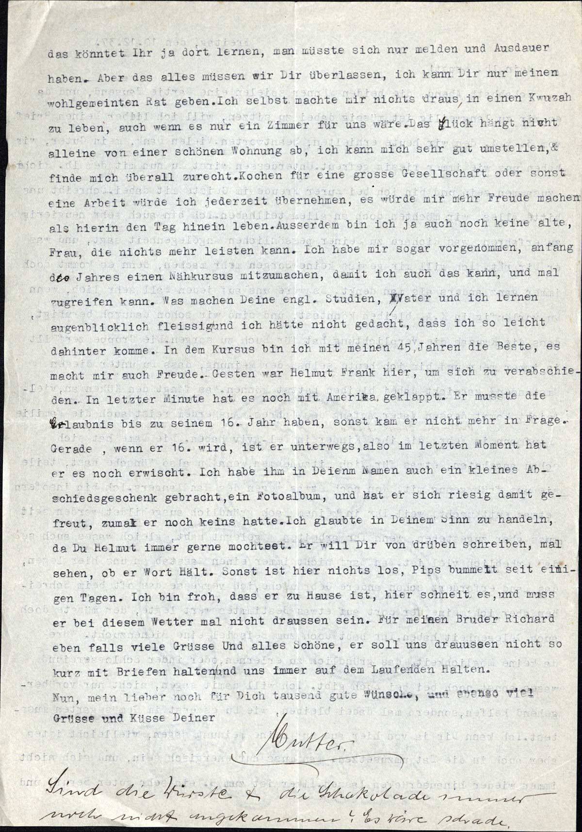 das könntet Ihr ja dort lernen, man müsste sich nur melden und Ausdauer haben. Aber das alles müssen wir Dir überlassen, ich kann Dir nur meinen wohlgemeinten Rat geben. Ich selbst machte mir nichts draus, in einen Kwuzah zu leben, auch wenn es nur ein Zimmer für uns wäre. Das Glück hängt nicht alleine von einer schönen Wohnung ab, ich kann mich sehr gut umstellen, & finde mich überall zurecht. Kochen für eine grosse Gesellschaft oder sonst eine Arbeit würde ich jederzeit übernehmen, es würde mir mehr Freude machen als hier in den Tag hinein leben. Ausserdem bin ich ja auch noch keine alte Frau, die nichts mehr leisten kann. Ich habe mir sogar vorgenommen, anfang des Jahres einen Nähkursus mitzumachen, damit ich auch das kann, und mal zugreifen kann. Was machen Deine engl. Studien, Vater und ich lernen augenblicklich fleissig und ich hätte nicht gedacht, dass ich so leicht dahinter komme. In dem Kursus bin ich mit meinen 45 Jahren die Beste, es macht mir auch Freude. Gestern war Helmut Frank hier, um sich zu verabschieden. In letzter Minute hat es noch mit Amerika geklappt. Er musste die Erlaubnis bis zu seinem 16. Jahr haben, sonst kam er nicht mehr in Frage. Gerade, wenn er 16. wird, ist er unterwegs, also im letzten Moment hat er es noch erwischt. Ich habe ihm in Deinem Namen auch ein kleines Abschiedsgeschenk gebracht, ein Fotoalbum, und hat er sich riesig damit gefreut, zumal er noch keins hatte. Ich glaubte in Deinem Sinn zu handeln, da Du Helmut immer gerne mochtest. Er will Dir von drüben schreiben, mal sehen, ob er Wort hält. Sonst ist hier nichts los, Pips bummelt seit einigen Tagen. Ich bin froh, dass er zu Hause ist, hier schneit es, und muss er bei diesem Wetter mal nicht draussen sein. Für meinen Bruder Richard ebenfalls viele Grüsse und alles Schöne, er soll uns draussen nicht so kurz mit Briefen halten und uns immer auf dem Laufenden halten.