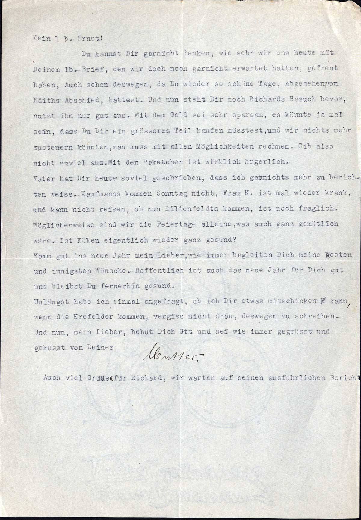Vater hat Dir heute soviel geschrieben, dass ich garnichts mehr zu berichten weiss. Kaufmanns kommen Sonntag nicht, Frau K. ist mal wieder krank, und kann nicht reisen, ob nun Lilienfeldts kommen, ist noch fraglich. Möglicherweise sind wir die Feiertage alleine, was auch ganz gemütlich wäre. Ist Küken eigentlich wieder ganz gesund?