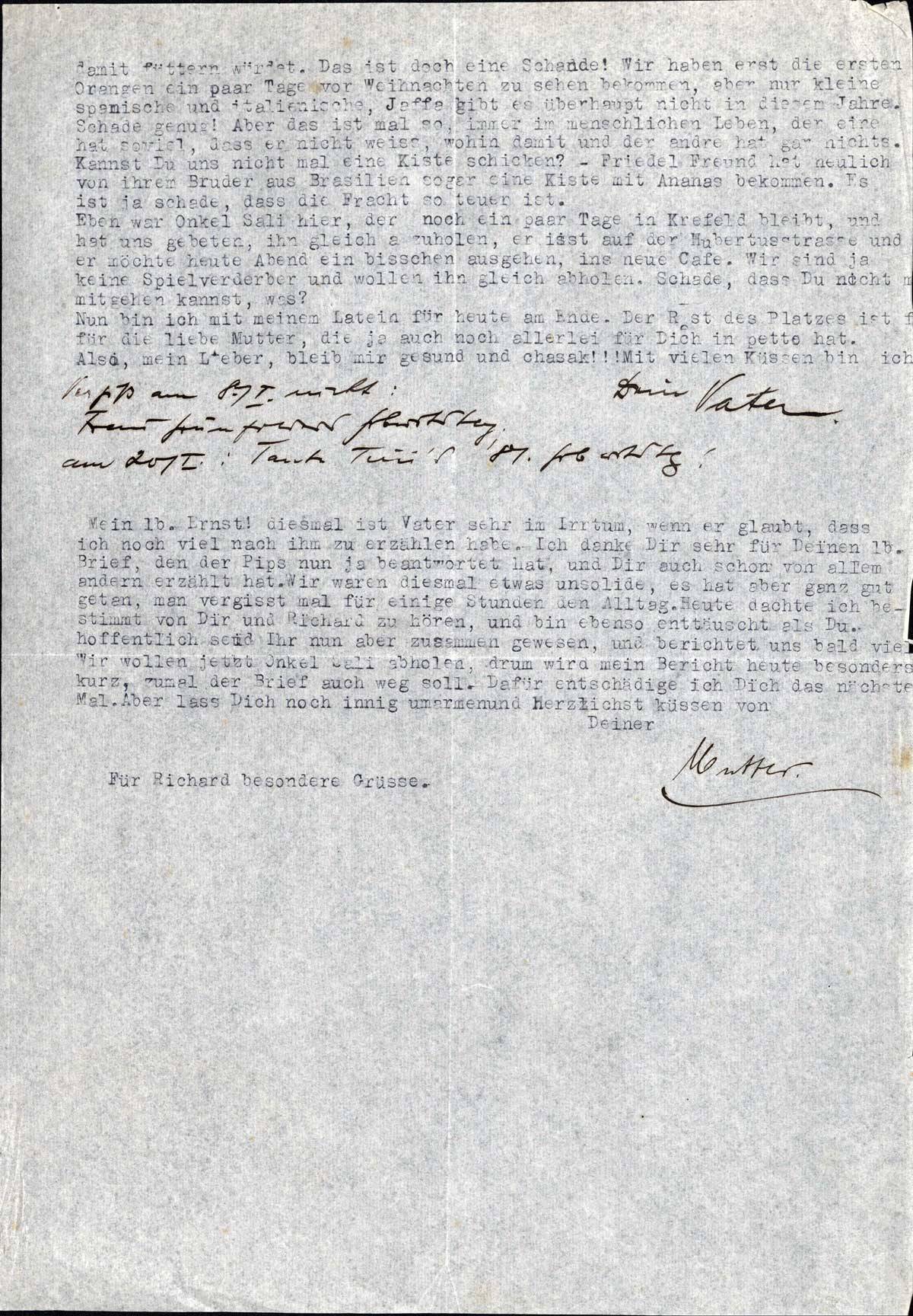 Mein lb. Ernst! diesmal ist Vater sehr im Irrtum, wenn er glaubt, dass ich noch viel nach ihm zu erzählen habe. Ich danke Dir sehr für Deinen lb. Brief, den der Pips nun ja beantwortet hat, und Dir auch schon von allem andern erzählt hat. Wir waren diesmal etwas unsolide, es hat aber ganz gut getan, man vergisst mal für einige Stunden den Alltag. Heute dachte ich bestimmt von Dir und Richard zu hören, und bin ebenso enttäuscht als Du. Hoffentlich seid Ihr nun aber zusammen gewesen, und berichtet uns bald viel. Wir wollen jetzt Onkel Sali abholen, drum wird mein Bericht heute besonders kurz, zumal der Brief auch weg soll. Dafür entschädige ich Dich das nächste Mal. Aber lass Dich noch innig umarmen und herzlichst küssen von