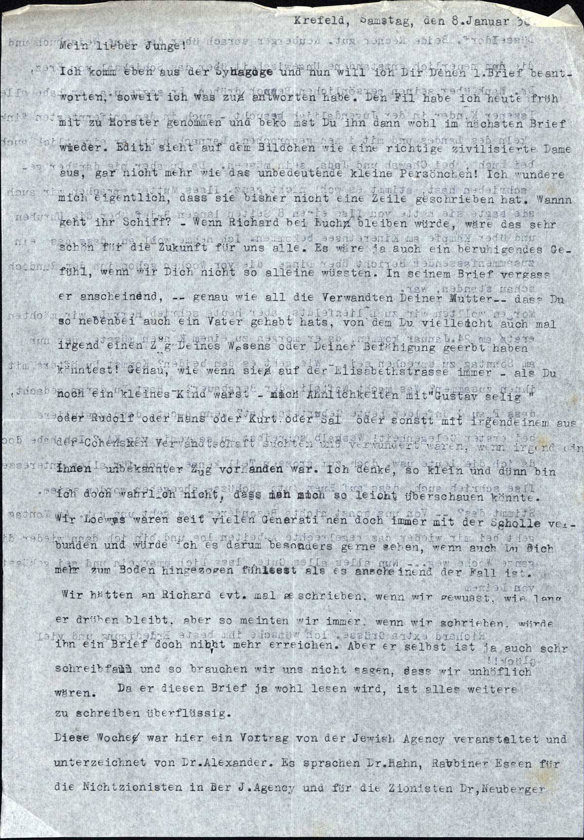Ich komm eben aus der Synagoge und nun will ich Dir Deinen lb. Brief beantworten, soweit ich was zu antworten habe. Den Film habe ich heute früh mit zu Horster genommen und bekommst Du ihn dann wohl im nächsten Brief wieder. Edith sieht auf dem Bildchen wie eine richtige zivilisierte Dame aus, gar nicht mehr wie das unbedeutend kleine Persönchen! Ich wundere mich eigentlich, dass sie bisher nicht eine Zeile geschrieben hat. Wann geht ihr Schiff? - Wenn Richard bei Euch bleiben würde, wäre das sehr schön für die Zukunft für uns alle. Es wäre ja auch ein beruhigendes Gefühl, wenn wir Dich nicht so alleine wüssten. In seinem Brief vergass er anscheinend, - - genau wie all die Verwandten Deiner Mutter - - dass Du so nebenbei auch ein Vater gehabt hast, von dem du vielleicht auch mal irgend einen Zug Deines Wesens oder Deiner Befähigung geerbt haben könntest! Genau, wie wenn sie auf der Elisabethstrasse immer - als Du noch ein kleines Kind warst - nach Ähnlichkeiten mit „Gustav selig” oder Rudolf oder Hans oder Kurt oder Sal oder sonst mit irgendeinem aus der Cohensen Verwandtschaft suchten und verwundert waren, wenn irgend ein ihnen unbekannter Zug vorhanden war. Ich denke, so klein und dünn bin ich doch wahrlich nicht, dass man mich so leicht überschauen könnte. Wir Loewys waren seit vielen Generationen doch immer mit der Scholle verbunden und würde ich es darum besonders gerne sehen, wenn auch Du Dich mehr zum Boden hingezogen fühltest als es anscheinend der Fall ist.