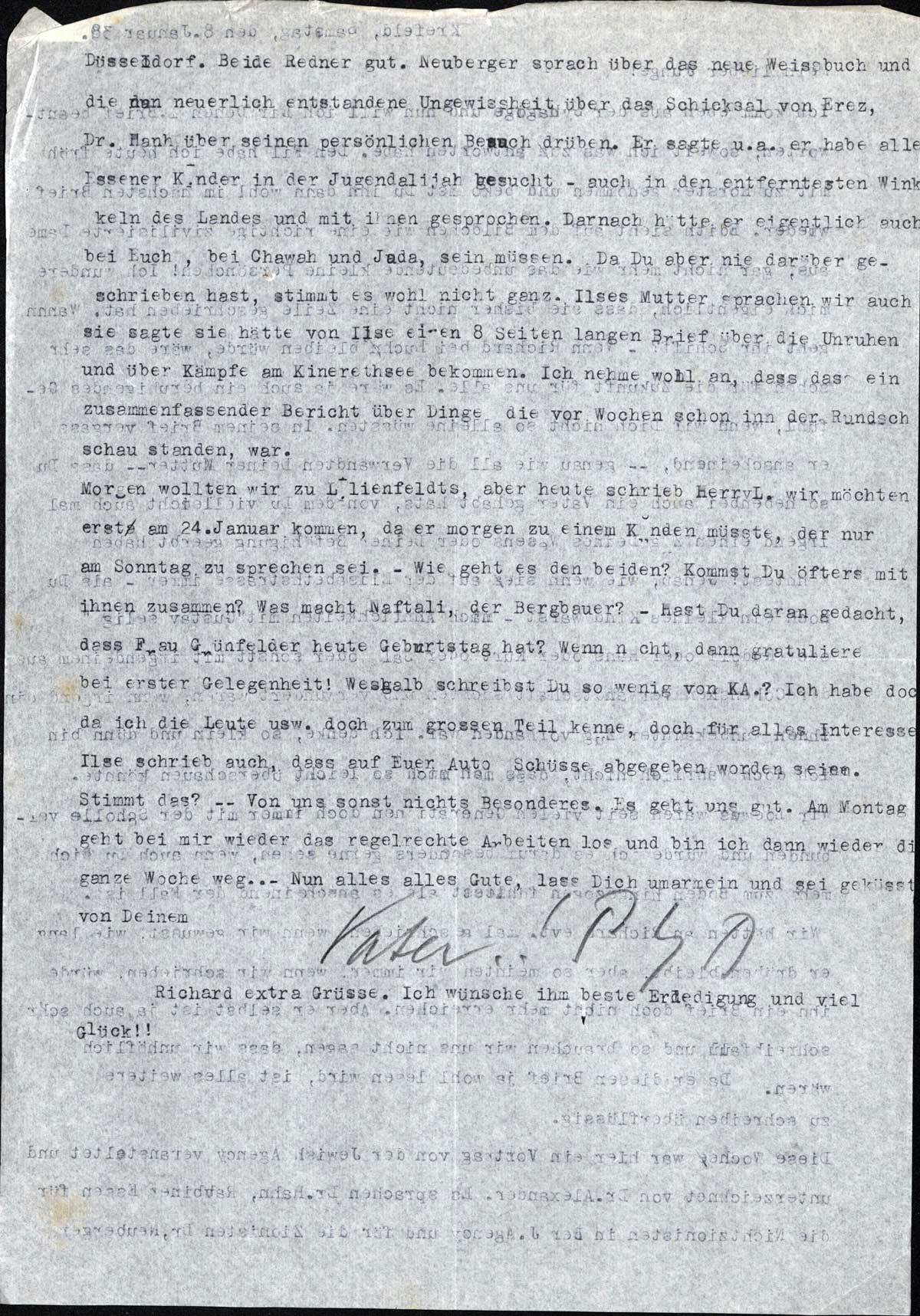 Düsseldorf. Beide Redner gut. Neuberger sprach über das neue Weissbuch und die nun neuerlich entstandene Ungewissheit über das Schicksal von Erez, Dr. Hahn über seinen persönlichen Besuch drüben. Er sagte u. a. er habe alle Essener Kinder in der Jugendalijah besucht - auch in den entferntesten Winkeln des Landes und mit ihnen gesprochen. Darnach hätte er eigentlich auch bei Euch, bei Chawah und Juda, sein müssen. Da Du aber nie darüber geschrieben hast, stimmt es wohl nicht ganz. Ilses Mutter sprachen wir auch sie sagte sie hätte von Ilse einen 8 Seiten langen Brief über die Unruhen und über Kämpfe am Kinerethsee bekommen. Ich nehme wohl an, dass das ein zusammenfassender Bericht über Dinge, die vor Wochen schon in der Rundschau standen, war.