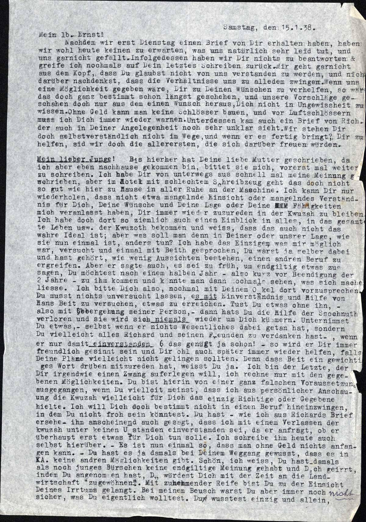 Mein lieber Junge! Bis hierher hat Deine liebe Mutter geschrieben, da ich aber eben nachhause gekommen bin, bittet sie mich, vorerst mal weiter zu schreiben. Ich habe Dir von unterwegs aus schnell mal meine Meinung geschrieben, aber im Hotel mit schlechtem Schreibzeug geht das doch nicht so gut wie hier zu Hause in aller Ruhe an der Maschine. Ich kann Dir nur wiederholen, dass nicht etwa mangelnde Einsicht oder mangelndes Verständnis für Dich, Deine Wünsche und Deine Lage oder Deine Fähigkeiten mich veranlasst haben, Dir immer wieder zuzureden in der Kwuzah zu bleiben. Ich habe doch dort so ziemlich auch einen Einblick in alles, in das gesamte Leben usw. der Kwuzoth bekommen und weiss, dass das auch nicht das wahre Ideal ist; aber was soll man denn in Deiner oder unsrer Lage, wie sie nun einmal ist, anders tun? Ich habe das Einzige, was mir möglich war, versucht und einmal mit Beith gesprochen, Du warst ja selber dabei und hast gehört, wie wenig Aussichten bestehen, einen andren Beruf zu ergreifen. Aber er sagte auch, es sei zu früh, um endgültig etwas zu sagen, Du möchtest nach einem halben Jahr - also kurz vor Beendigung der 2 Jahre - zu ihm kommen und könnte man dann nochmals sehen, was sich machen liesse. Ich bitte Dich also, nochmal mit Deinem Onkel dort vorzusprechen. Du musst nichts unversucht lassen, es mit Einverständnis und Hilfe von Hans Beit zu versuchen, etwas zu erreichen. Tust Du etwas ohne ihn, - also mit Uebergehung seiner Person, - dann hast Du die Hilfe der Sochnuth verloren und sie wird sich niemals wieder um Dich kümmern. Unternimmst Du etwas, - selbst wenn er nichts Wesentliches dabei getan hat, sondern Du vielleicht alles Richard und seinen Freunden zu verdanken hast -, wenn er nur damit einverstanden (das genügt ja schon! - so wird er Dir immer freundlich gesinnt sein und Dir wohl auch später immer wieder helfen, falls Deine Pläne vielleicht nicht gelingen sollten. Denn dass Beit ein gewichtiges Wort drüben mitzureden hat, weisst Du ja. Ich bin der Letzte, der Dir irgendwie einen Zwang auferleben will, ich rechne nur mit den gegebenen Möglichkeiten. Du bist hierin von einer ganz falschen Voraussetzung ausgegangen, wenn Du vielleicht meinst, dass ich aus persönlicher Anschauung die Kwuzah vielleicht für Dich das einzig Richtige oder Gegebene hielte. Ich will Dich doch bestimmt nicht in einen Beruf hineinzwingen, in dem Du nicht froh sein könntest. Du hast - wie ich aus Richards Brief ersehe - ihm anscheinend auch gesagt, dass ich mit einem Verlassen der Kwuzah unter keinen Umständen einverstanden sei, da er anfragt, ob er überhaupt erst etwas für Dich tun solle. Ich schreibe ihm heute auch selbst hierüber. - Es ist nun einmal so, dass man ohne Geld nichts anfangen kann. - Du hast es ja damals bei Deinem Weggang gewusst, dass es in KA. keine andren Möglichkeiten gibt. Schön, ich weiss, Du hast damals als noch junges Bürschen keine endgültige Meinung gehabt und Dich geirrt, indem Du angenommen hast, Du würdest Dich mit der Zeit an die Landwirtschaft „zu gewöhnen”. Mit zunehmender Reife bist Du zu der Einsicht Deines Irrtums gelangt. Bei meinem Besuch warst Du aber immer noch nicht sicher, was Du eigentlich wolltest. Du wusstest einzig und allein,