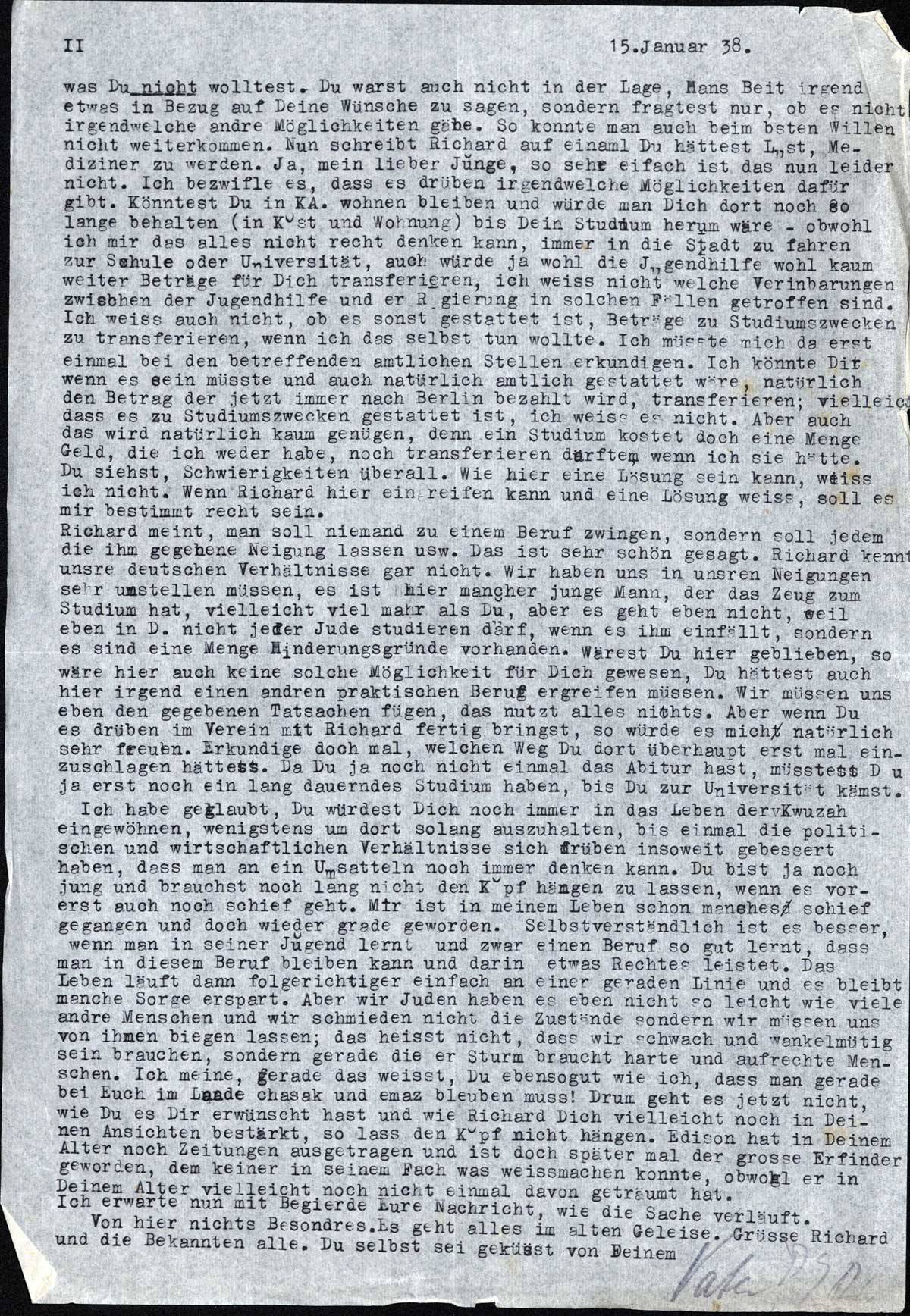 Richard meint, man soll niemand zu einem Beruf zwingen, sondern soll jedem die ihm gegebene Neigung lassen usw. Das ist sehr schön gesagt. Richard kennt unsre deutschen Verhältnisse gar nicht. Wir haben uns in unsren Neigungen sehr umstellen müssen, es ist hier mancher junge Mann, der das Zeug zum Studium ht, vielleicht viel mehr als Du, aber es geht eben nicht, weil eben in D. nicht jeder Jude studieren darf, wenn es ihm einfällt, sondern es sind eine Menge Hinderungsgründe vorhanden. Wärest Du hier geblieben, so wäre hier auch keine solche Möglichkeit für Dich gewesen, Du hättest auch hier irgend einen andren praktischen Beruf ergreifen müssen. Wir müssen uns eben den gegebenen Tatsachen fügen, das nutzt alles nichts. Aber wenn Du es drüben im Verein mit Richard fertig bringst, so würde es mich natürlich sehr freuen. Erkundige doch mal, welchen Weg Du dort überhaupt erst mal einzuschlagen hättest. Da Du ja noch nicht einmal das Abitur hast, müsstest Du ja erst doch ein lang dauerndes Studium haben, bis Du zur Universität kämst.