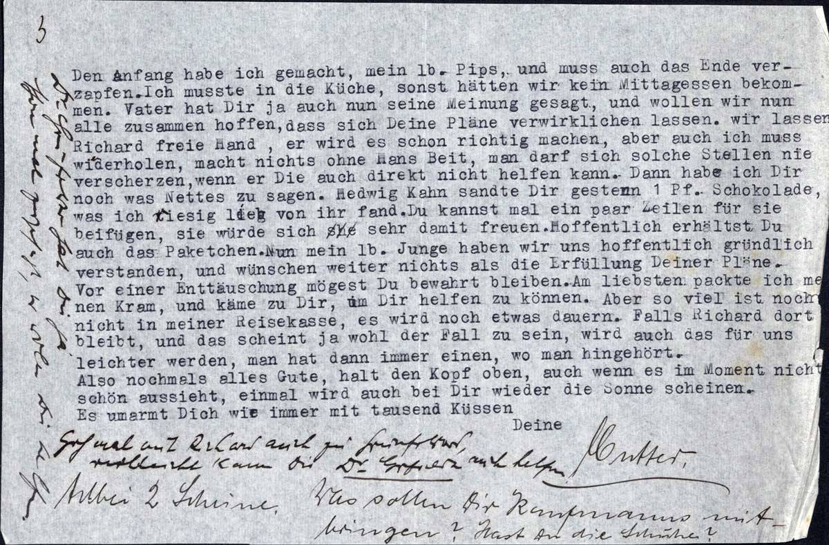 Den Anfang habe ich gemacht, mein lb. Pips, und muss auch das Ende verzapfen. Ich musste in die Küche, sonst hätten wir kein Mittagessen bekommen. Vater hat Dir ja auch nun seine Meinung gesagt, und wollen wir nun alle zusammen hoffen, dass sich Deine Pläne verwirklichen lassen. Wir lassen Richard freie Hand, er wird es schon richtig machen, aber auch ich muss wiederholen, macht nichts ohne Hans Beit, man darf sich solche Stellen nie verscherzen, wenn er Dir auch direkt nicht helfen kann. Dann habe ich Dir noch was Nettes zu sagen. Hedwig Kahn sandte Dir gestern 1 Pf. Schokolade, was ich riesig lieb von ihr fand. Du kannst mal ein paar Zeilen für sie beifügen, sie würde sich sehr damit freuen. Hoffentlich erhältst Du auch das Paketchen. Nun mein lb. Junge haben wir uns hoffenltich gründlich verstanden, und wünschen weiter nichts als die Erfüllung Deiner Pläne. Vor einer Enttäuschung mögest Du bewahrt bleiben. Am liebsten packte ich meinen Kram, und käme zu Dir, um Dir helfen zu können. Aber so viel ist noch nicht in meiner Reisekasse, es wird noch etwas dauern. Falls Richard dort bleibt, und das scheint ja wohl der Fall zu sein, wird auch das für uns leichter werden, man hat dann immer einen, wo man hingehört.
