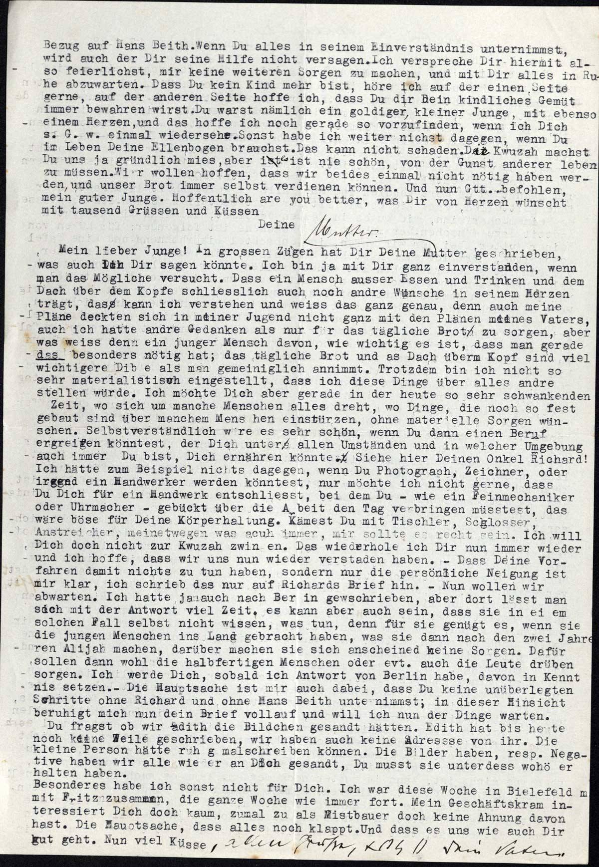 Mein lieber Junge! In grossen Zügen hat Dir Deine Mutter geschrieben, was auch ich Dir sagen könnte. Ich bin ja mit Dir ganz einverstanden, wenn man das Mögliche versucht. Dass ein Mensch ausser Essen und Trinken und dem Dach über dem Kopfe schliesslich auch noch andre Wünsche in seinem Herzen trägt, das kann ich verstehen und weiss das ganz genau, denn auch meine Pläne deckten sich in meiner Jugend nicht ganz mit den Plänen meines Vaters, auch ich hatte andre Gedanken als nur für das tägliche Brot zu sorgen, aber was weiss denn ein junger Mensch davon, wie wichtig es ist, dass man gerade das besonders nötig hat; das tägliche Brot und das Dach überm Kopf sind viel wichtigere Dinge als man gemeiniglich annimmt. Trotzdem bin ich nicht so sehr materialistisch eingestellt, dass ich diese Dinge über alles andre stellen würde. Ich möchte Dich aber gerade in der heute so sehr schwankenden Zeit, wo sich um manche Menschen alles dreht, wo Dinge, die noch so fest gebaut sind über manchem Menschen einstürzen, ohne materielle Sorgen wünschen. Selbstverständlich wäre es sehr schön, wenn Du dann einen Beruf ergreifen könntest, der Dich unter allen Umständen und in welcher Umgebung auch immer Du bist, Dich ernähren könnte. Siehe hier Deinen Onkel Richard! Ich hätte zum Beispiel nichts dagegen, wenn Du Photograph, Zeichner, oder irgend ein Handwerker werden könntest, nur möchte ich nicht gerne, dass Du Dich für ein Handwerk entschliesst, bei dem Du - wie ein Feinmechaniker oder Uhrmachter - gebückt über die Arbeit den Tag verbringen müsstest, das wäre böse für Deine Körperhaltung. Kämest Du mit Tischler, Schlosser, Anstreicher, meinetwegen was auch immer, mir sollte es recht sein. Ich will Dich doch nicht zur Kwuzah zwingen. Das wiederhole ich Dir nun immer wieder und ich hoffe, dass wir uns nun wieder verstanden haben. - Dass Deine Vorfahren damit nichts zu tun haben, sondern nur die persönliche Neigung ist mir klar, ich schrieb das nur auf Richards Brief hin. - Nun wollen wir abwarten. Ich hatte ja auch nach Berlin geschrieben, aber dort lässt man sich mit der Antwort viel Zeit, es kann aber auch sein, dass sie in einem solchen Fall selbst nicht wissen, was tun, denn für sie genügt es, wenn sie die jungen Menschen ins Land gebracht haben, was sie dann nach den zwei Jahren Alijah machen, darüber machen sie sich anscheinend keine Sorgen. Dafür sollen dann wohl die halbfertigen Menschen oder evt. auch die Leute drüben sorgen. Ich werde Dich, sobald ich Antwort von Berlin habe, davon in Kenntnis setzen. - Die Hauptsache ist mir auch dabei, dass Du keine unüberlegten Schritte ohne Richard und ohne Hans Beith unternimmst; in dieser Hinsicht beruhigt mich nun dein Brief vollauf und will ich nun der Dinge warten.