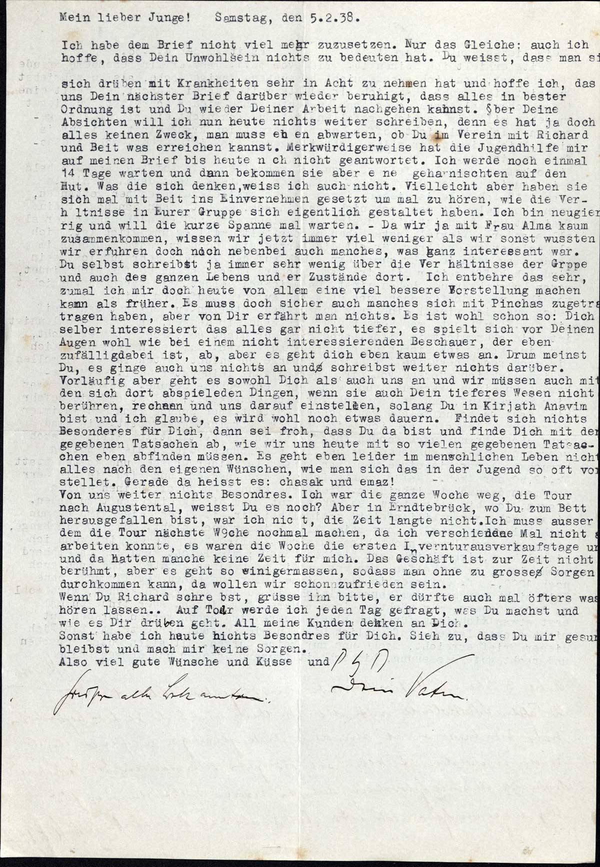 Ich habe dem Brief nicht viel mehr zuzusetzen. Nur das Gleiche: auch ich hoffe, dass Dein Unwohlsein nichts zu bedeuten hat. Du weisst, dass man sich drüben mit Krankheiten sehr in Acht zu nehmen hat und hoffe ich, dass uns Dein nächster Brief darüber wieder beruhigt, dass alles in bester Ordnung ist und Du wieder Deiner Arbeit nachgehen kannst. Über Deine Absichten will ich nun heute nichts weiter schreiben, denn es hat ja doch alles keinen Zweck, man muss eben abwarten, ob Du im Verein mit Richard und Beit was erreichen kannst. Merkwürdigerweise hat die Jugendhilfe mir auf meinen Brief bis heute noch nicht geantwortet. Ich werde noch einmal 14 Tage warten und dann bekommen sie aber einen geharnischten auf den Hut. Was die sich denken, weiss ich auch nicht. Vielleicht aber haben sie sich mal mit Beit ins Einvernehmen gesetzt um mal zu hören, wie die Verhältnisse in Eurer Gruppe sich eigentlich gestaltet haben. Ich bin neugierig und will die kurze Spanne mal warten. - Da wir ja mit Frau Alma kaum zusammenkommen, wissen wir jetzt immer viel weniger als wir sonst wussten, wir erfuhren doch noch nebenbei auch manches, was ganz interessant war. Du selbst schreibst ja immer sehr wenig über die Verhältnisse der Gruppe und auch des ganzen Lebens und der Zustände dort. Ich entbehre das sehr, zumal ich mir doch heute von allem eine viel bessere Vorstellung machen kann als früher. Es muss doch sicher auch manches sich mit Pinchas zugetragen haben, aber von Dir erfährt man nichts. Es ist wohl schon so: Dich selber interessiert das alles gar nicht tiefer, es spielt sich vor Deinen Augen wohl wie bei einem nicht interessierten Beschauer, der eben zufällig dabei ist, ab, aber es geht dich eben kaum etwas an. Drum meinst Du, es ginge auch uns nichts an und schreibst weiter nichts darüber. Vorläufig aber geht es sowohl Dich als auch uns an und wir müssen auch mit den sich dort abspielenden Dingen, wenn sie auch Dein tieferes Wesen nicht berühren, rechnen und uns darauf einstellen, solang Du in Kirjath Anavim bist und ich glaube, es wird wohl noch etwas dauern. Findet sich nichts Besonderes für Dich, dann sei froh, dass Du da bist und finde Dich mit den gegebenen Tatsachen ab, wie wir uns heute mit so vielen gegebenen Tatsachen eben abfinden müssen. Es geht eben leider im menschlichen Leben nicht alles nach den eigenen Wünschen, wie man sich das in der Jugend so oft vorstellt. Gerade da heisst es: chasak und emaz!