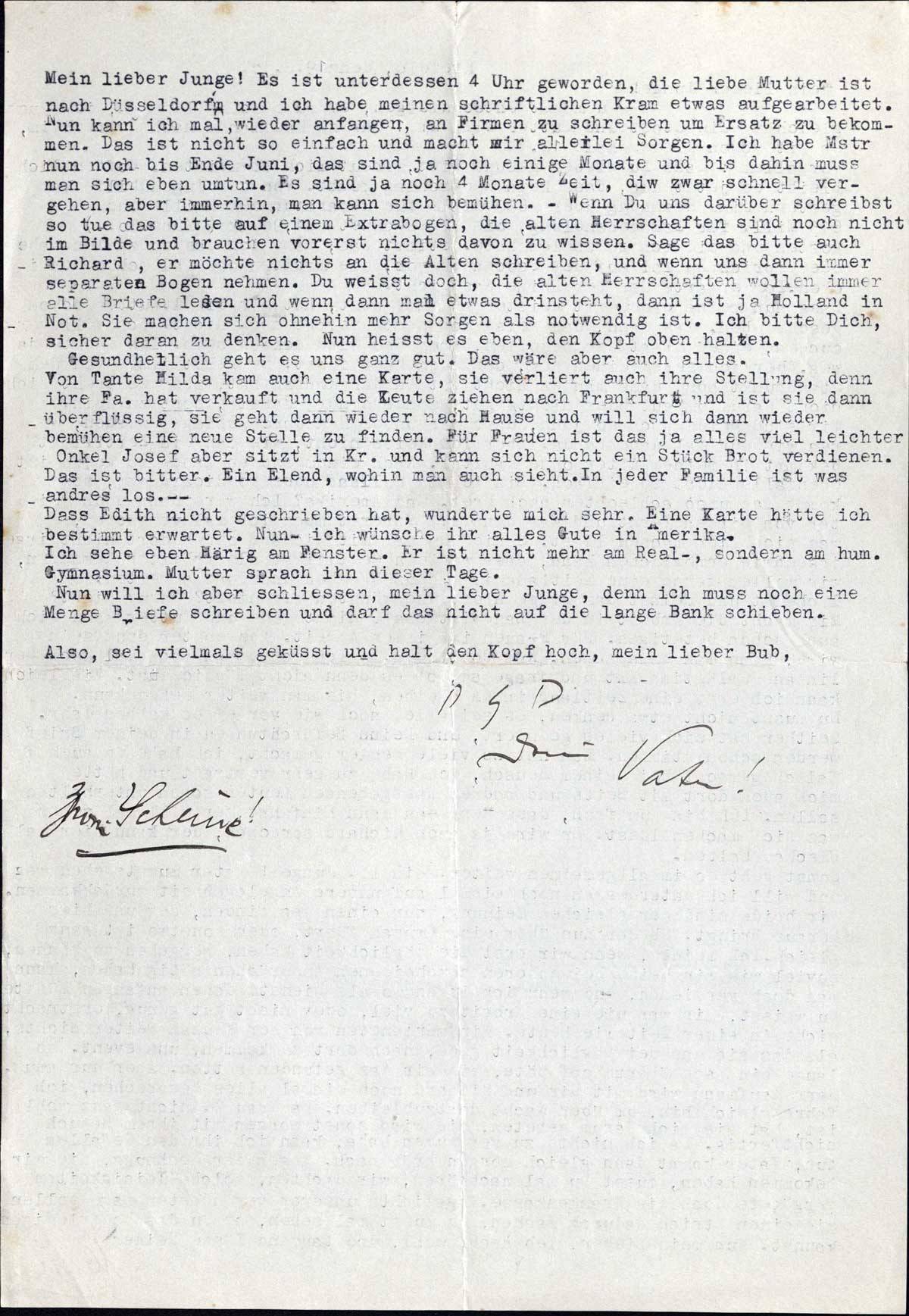 Mein lieber Junge! Es ist unterdessen 4 Uhr geworden, die liebe Mutter ist nach Düsseldorf, und ich habe meinen schriftlichen Kram etwas aufgearbeitet. Nun kann ich mal wieder anfangen, an Firmen zu schreiben um Ersatz zu bekommen. Das ist nicht so einfach und macht mir allerlei Sorgen. Ich habe Mstr nun noch bis Ende Juni, das sind ja noch einige Monate und bis dahin muss man sich eben umtun. Es sind ja noch 4 Monate Zeit, die zwar schnell vergehen, aber immerhin, man kann sich bemühen. - Wenn Du uns darüber schreibst, so tue das bitte auf einem Extrabogen, die alten Herrschaften sind noch nicht im Bilde und brauchen vorerst nichts davon zu wissen. Sage das bitte auch Richard, er möchte nichts an die Alten schreiben, und wenn uns dann immer separaten Bogen nehmen. Du weisst doch, die alten Herrschaften wollen immer alle Briefe lesen und wenn dann mal etwas drinsteht, dann ist ja Holland in Not. Sie machen sich ohnehin mehr Sorgen als notwendig ist. Ich bitte Dich, sicher daran zu denken. Nun heisst es eben, den Kopf oben halten.
