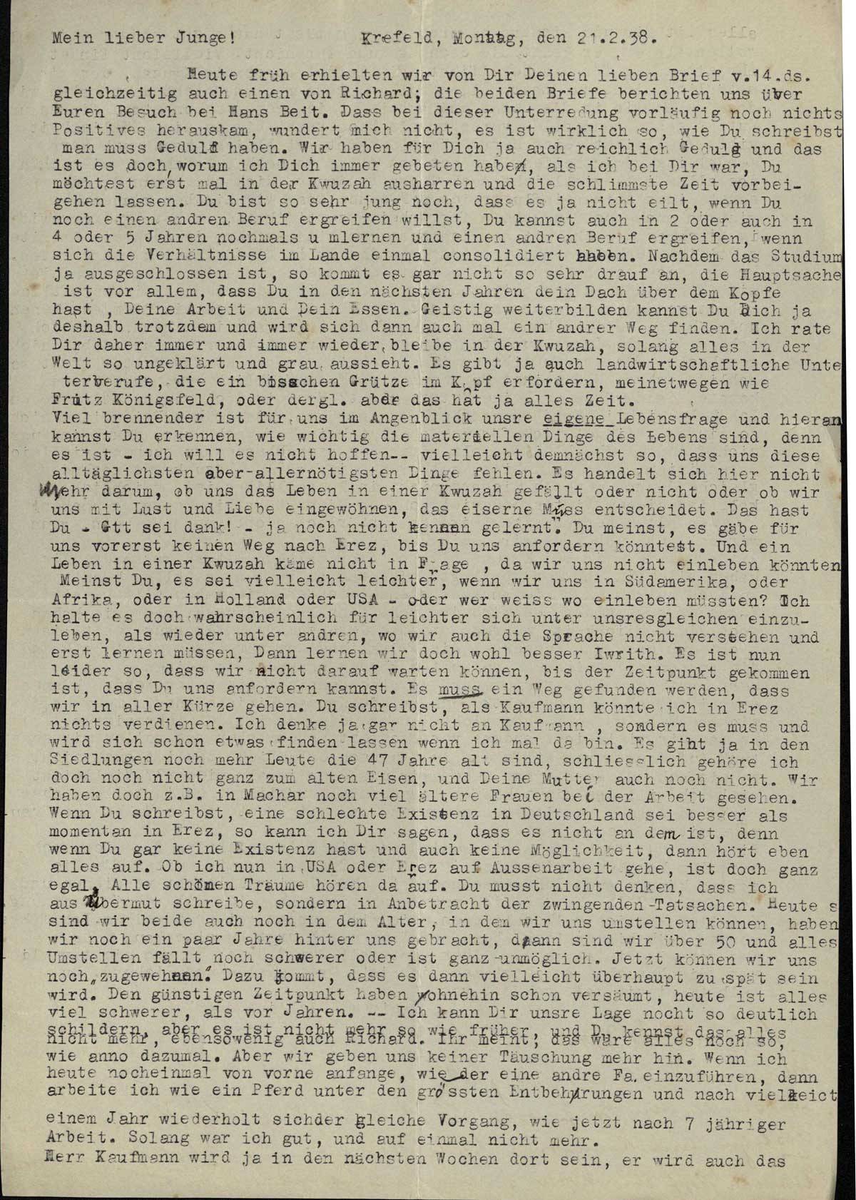 Heute früh erhielten wir von Dir Deinen lieben Brief v. 14. ds. gleichzeitig auch einen von Richard; die beiden Briefe berichten uns über Euren Besuch bei Hans Beit. Dass bei dieser Unterredung vorläufig noch nichts Positives herauskam, wundert mich nicht, es ist wirklich so, wie Du schreibst, man muss Geduld haben. Wir haben für Dich ja auch reichlich Geduld und das ist es doch, worum ich Dich immer gebeten habe, als ich bei Dir war, Du möchtest erst mal in der Kwuzah ausharren und die schlimmste Zeit vorbeigehen lassen. Du bist so sehr jung noch, dass es ja nicht eilt, wenn Du noch einen andren Beruf ergreifen willst, Du kannst auch in 2 oder auch in 4 oder 5 Jahren nochmals umlernen und einen andren Beruf ergreifen, wenn sich die Verhältnisse im Lande einmal consolidiert haben. Nachdem das Studium ja ausgeschlossen ist, so kommt es gar nicht so sehr drauf an, die Hauptsache ist vor allem, dass Du in den nächsten Jahren dein Dach über dem Kopfe hast, Deine Arbeit und Dein Essen. Geistig weiterbilden kannst Du Dich ja deshalb trotzdem und wird sich dann auch mal ein andrer Weg finden. Ich rate Dir daher immer und immer wieder, bleibe in der Kwuzah, solang alles in der Welt so ungeklärt und grau aussieht. Es gibt ja auch landwirtschaftliche Unterberufe, die ein bisschen Grütze im Kopf erfordern, meinetwegen wie Fritz Königsfeld, oder dergl. aber das hat ja alles Zeit.