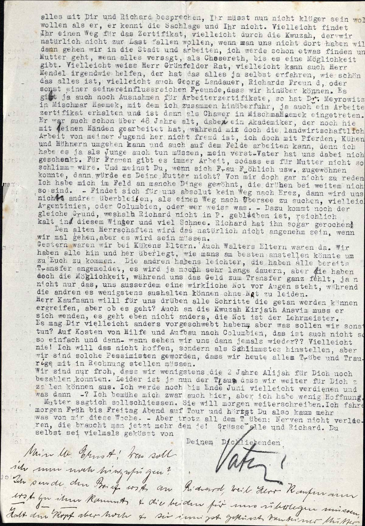 alles mit Dir und Richard besprechen, Ihr müsst nun nicht klüger sein wollen als er, er kennt die Sachlage und Ihr nicht. Vielleicht findet Ihr einen Weg für das Zertifikat, vielleicht durch die Kwuzah, der wir natürlich nicht zur Last fallen wollen, wenn man uns nicht dort haben will, dann gehen wir in die Stadt und arbeiten, ich werde schon etwas finden und Mutter geht, wenn alles versagt, als Chasereth, bis es eine Möglichkeit gibt. Vielleicht weiss Herr Grünfelder Rat, vielleicht kann auch Herr Mendel irgendwie helfen, der hat das alles ja selbst erfahren, wie schön das alles ist, vielleicht auch Georg Landauer, Richards Freund, oder sonst einer seiner einflussreichen Freunde, dass wir hinüber können. Es gibt ja auch noch Ausnahmen für Arbeiterzertifikate, so hat Dr. Meyrowitsch in Mischmar Haemek, mit dem ich zusammen hinüberfuhr, ja auch ein Arbeiterzertifikat erhalten und ist dann als Chawer in Mischmar Haemek eingetreten. Er war auch schon über 48 Jahre alt, dabei ein Akademiker, der noch nie mit seinen Händen gearbeitet hat, während mir doch die landwirtschaftliche Arbeit von meiner Jugend her nicht fremd ist, ich doch mit Pferden, Kühen und Hühnern umgehen kann und auch auf dem Felde arbeiten kann, denn ich habe s ja als Junge auch tun müssen, meiner verst. Vater hat uns dabei nichts geschenkt. Für Frauen gibt es immer Arbeit, sodass es für Mutter nicht so schlimm wäre. Und meinst Du, wenn sich Frau Fröhlich usw. zugewöhnen konnte, dann würde es Deine Mutter nicht? Von mir doch gar nicht zu reden. Ich habe mich im Feld an manche Dinge gewöhnt, die drüben bei weitem nicht so sind. - Findet sich für uns absolut kein Weg nach Erez, dann wird uns nichts andres überbleiben, als einen Weg nach Übersee zu suchen, vielleicht Argentinien, oder Columbien, oder wer weiss was. - Dazu kommt noch der gleiche Grund, weshalb Richard nicht in P. geblieben ist, reichlich kalt in diesem Winter und viel Schnee. Richard hat ihn sogar gerochen.