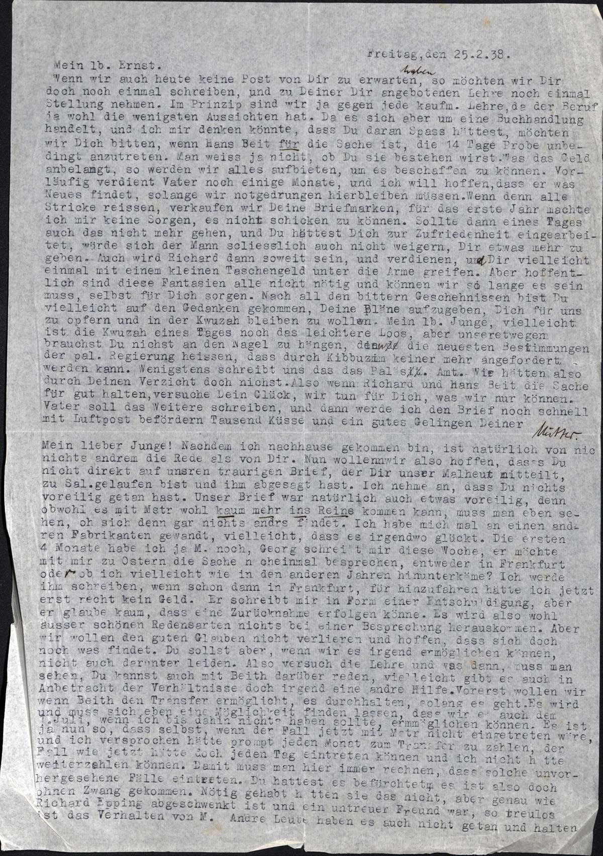 Wenn wir auch heute keine Post von Dir zu erwarten haben, so möchten wir Dir doch noch einmal schreiben, und zu Deiner Dir angebotenen Lehre noch einmal Stellung nehmen. Im Prinzip sind wir ja gegen jede kaufm. Lehre, da der Beruf ja wohl die wenigsten Aussichten hat. Da es sich aber um eine Buchhandlung handelt, und ich mir denken könnte, dass Du daran Spass hättest, möchten wir Dich bitten, wenn Hans Beit für die Sache ist, die 14 Tage Probe unbedingt anzutreten. Man weiss ja nicht, ob Du sie bestehen wirst. Was das Geld angelangt, so werden wir alles aufbieten, um es beschaffen zu können. Vorläufig verdient Vater noch einige Monate, und ich will hoffen, dass er was Neues findet, solange wir notgedrungen hierbleiben müssen. Wenn denn alle Stricke reissen, verkaufen wir Deine Briefmarken, für das erste Jahr machte ich mir keine Sorgen, es nicht schicken zu können. Sollte dann eines Tages auch das nicht mehr gehen, und Du hättest Dich zur Zufriedenheit eingearbeitet, würde sich der Mann schliesslich auch nicht weigern, Dir etwas mehr zu geben. Auch wird Richard dann soweit sein, und verdienen, und Dir vielleicht einmal mit einem kleinen Taschengeld unter die Arme greifen. Aber hoffentlich sind diese Fantasien alle nicht nötig und können wir so lange es sein muss, selbst für Dich sorgen. Nach all den bittern Geschehnissen bist Du vielleicht auf den Gedanken gekommen, Deine Pläne aufzugeben, Dich für uns zu opfern und in der Kwuzah bleiben zu wollen. Mein lb. Junge, vielleicht ist die Kwuzah eines Tages noch das leichtere Los, aber unseretwegen brauchst Du nichts an den Nagel zu hängen, denn die neuesten Bestimmungen der pal. Regierung heissen, dass durch Kibbuzim keiner mehr angefordert werden kann. Wenigstens schreibt uns das das Pal. Amt. Wir hätten also durch Deinen Verzicht doch nichts. Also wenn Richard und Hans Beit die Sache für gut halten, versuche Dein Glück, wir tun für Dich, was wir nur können. Vater soll das Weitere schreiben, und dann werde ich den Brief noch schnell mit Luftpost befördern. Tausend Küsse und ein gutes Gelingen Deiner