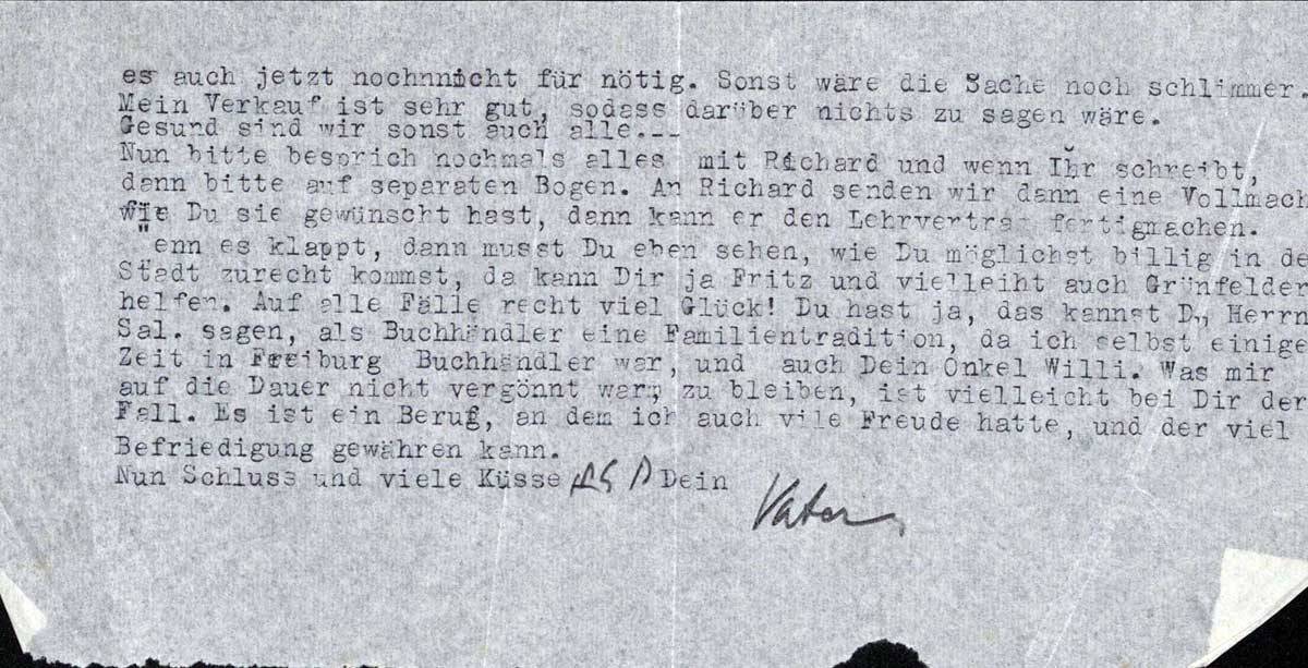 Nun bitte besprich nochmals alles mit Richard und wenn Ihr schreibt, dann bitte auf separaten Bogen. An Richard senden wir dann eine Vollmacht, wie Du sie gewünscht hast, dann kann er den Lehrvertrag fertigmachen. Wenn es klappt, dann musst Du eben sehen, wie Du möglichst billig in der Stadt zurecht kommst, da kann Dir ja Fritz und vielleicht auch Grünfelders helfen. Auf alle Fälle recht viel Glück! Du hast ja, das kannst Du Herrn Sal. sagen, als Buchhändler eine Familientradition, da ich selbst einige Zeit in Freibrug Buchhändler war, und auch Dein Onkel Willi. Was mir auf die Dauer nicht vergönnt war, zu bleiben, ist vielleicht bei Dir der Fall. Es ist ein Beruf, an dem ich auch viel Freude hatte, und der viel Befriedigung gewähren kann.