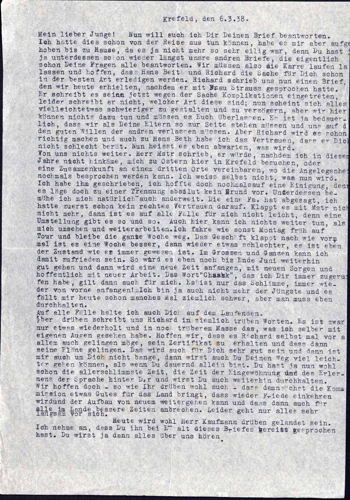 Mein lieber Junge! Nun will auch ich Dir Deinen Brief beantworten. Ich hätte dies schon von der Reise aus tun können, habe es mir aber aufgehoben bis zu Hause, da es ja nicht mehr so sehr eilig war, denn Du hast ja unterdessen schon wieder längst unsre andren Briefe, die eigentlich schon Deine Fragen alle beantworten. Wir müssen also die Karre laufen lassen und hoffen, dass Hans Beith und Richard die Sache für Dich schon in der besten Art erledigen werden. Richard schrieb uns nun einen Brief, den wir heute erhielten, nachdem er mit Frau Strauss gesprochen hatte. Er schreibt es seien jetzt wegen der Sache Komplikationen eingetreten, leider schreibt er nicht, welcher Art diese sind; nun scheint sich alles vielleicht etwas schwieriger zu gestalten und zu verzögern, aber wir hier können nichts dazu tun und müssen es Euch überlassen. Es ist ja bedauerlich, dass wir als Deine Eltern so zur Seite stehen müssen und uns auf den guten Willen der andren verlassen müssen. Aber Richard wird es schon richtig machen und auch zu Hans Beth habe ich das Vertrauen, dass er Dich nicht schlecht berät. Nun heisst es eben abwarten, was wird.