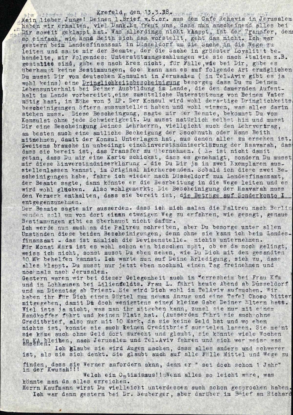 Mein lieber Junge! Deinen l. Brief v. 6. cr. aus dem Cafe Rehavia in Jerusalem haben wir erhalten, viel Dank. Es freut uns, dass nun anscheinend alles bei Dir soweit geklappt hat. Was allerdings nicht klappt, ist der Transfer, denn so einfach, wie Hans Beith sich das vorstellt, geht das nicht. Ich war gestern beim Landesfinanzamt in Düsseldorf um die Sache in die Wege zu leiten und sagte mir der Beamte, der die Sache in grösster Loyalität behandelte, mir Folgendes: Unterstützungszahlungen wie sie nach Italien z. B. gestattet sind, gäbe es nach Erez nicht, für Fälle, wie bei Dir, gäbe es überhaupt keine Bestimmungen, doch kann man es auf folgende Art ermöglichen. Du musst Dir vom deutschen Konsulat in Jerusalem (in Tel-Aviv gibt es ja wohl keins) eine Dringlichkeitsbescheinigung besorgen, dass Du zu Deinem Lebensunterhalt bei Deiner Ausbildung im Lande, die den dauernden Aufenthalt im Lande vorbereitet, eine zusätzliche Unterstützung von Deinem Vater nötig hast, in Höhe von 3 LP. Der Konsul wird wohl derartige Dringlichkeitsbescheinigungen öfters auszustellen haben und wohl wissen, was alles darin stehen muss. Diese Bescheinigung, sagte mir der Beamte, bekommst Du vom Konsulat ohne jede Schwierigkeit. Du musst natürlich selbst hin und musst Dir eine Bescheinigung Deines Lehrherrn, vielleicht auch den Lehrvertrag, am besten auch eine amtliche Bescheinigung der Ssochnuth oder Hans Beith mitnehmen, damit der Konsul Unterlagen hat, aus denen alles zu ersehen ist. Zweitens brauche in unbedingt eine Einverständniserklärung der Haavarah, dass sie bereit ist, das Transfer zu übernehmen. (Es ist nicht damit getan, dass Du mir eine Karte schickst, dass es genehmigt, sondern Du musst mir diese Einverständniserklärung - die Du Dir ja in zwei Exemplaren ausstellen lassen kannst, im Original hierhersenden. Sobald ich diese zwei Bescheinigungen habe, fahre ich wieder nach Düsseldorf zum Landesfinanzamt, der Beamte sagte, dann könnte er die Bearbeitung in die Wege leiten und es wird wohl glücken. Also wohlgemerkt: Die Bescheinigung der Haavarah muss den Vermerk enthalten, dass sie bereit ist, die Beträge auf Sonderkonto I entgegenzunehmen.