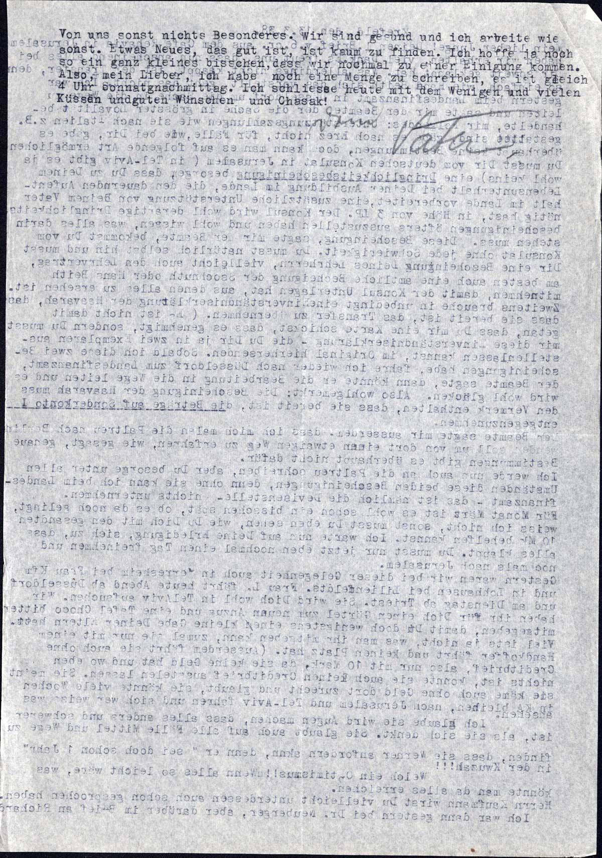 Von uns sonst nichts Besonderes. Wir sind gesund und ich arbeite wie sonst. Etwas Neues, das gut ist, ist kaum zu finden. Ich hoffe ja noch so ein ganz kleines bisschen, dass wir nochmal zu einer Einigung kommen. Also, mein Lieber, ich habe noch eine Menge zu schreiben, es ist gleich 4 Uhr Sonntagnachmittag. Ich schliesse heute mit dem Wenigen und vielen Küssen und guten Wünschen und Chasak!