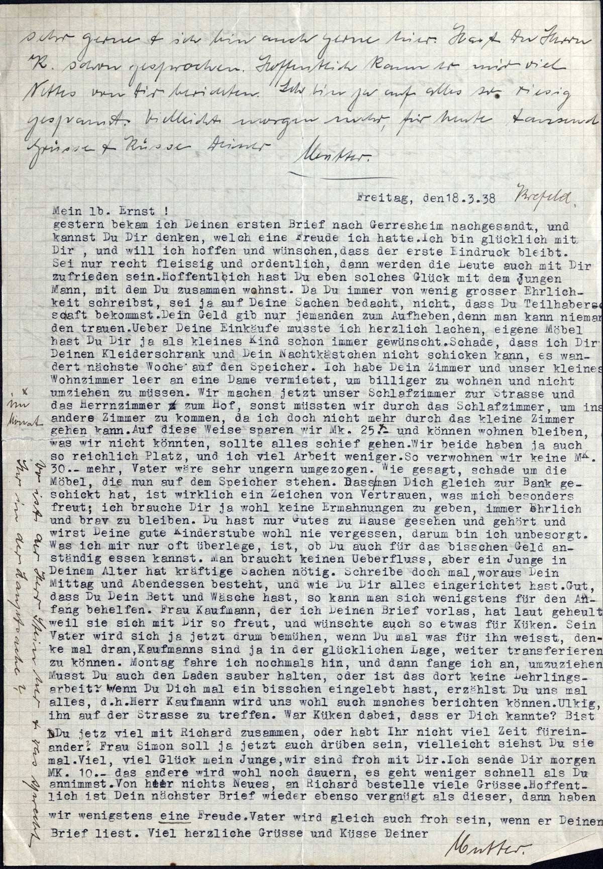 gestern bekam ich Deinen ersten Brief nach Gerresheim nachgesandt, und kannst Du Dir denken, welch eine Freude ich hatte. Ich bin glücklich mit Dir, und will ich hoffen und wünschen, dass der erste Eindruck bleibt. Sei nur recht fleissig und ordentlich, dann werden die Leute auch mit Dir zufrieden sein. Hoffentlich hast Du eben solches Glück mit dem jungen Mann, mit dem Du zusammen wohnst. Da Du immer von wenig grosser Ehrlichkeit schreibst, sei ja auf Deine Sachen bedacht, nicht, dass Du Teilhaberschaft bekommst. Dein Geld gib nur jemanden zum Aufheben, denn man kann niemanden trauen. Ueber Deine Einkäufe musste ich herzlich lachen, eigene Möbel hast Du Dir ja als kleines Kind schon immer gewünscht. Schade, dass ich Dir Deinen Kleiderschrank und Dein Nachtkästchen nicht schicken kann, es wandert nächste Woche auf den Speicher. Ich habe Dein Zimmer und unser kleines Wohnzimmer leer an eine Dame vermietet, um billiger zu wohnen und nicht umziehen zu müssen. Wir machen jetzt unser Schlafzimmer zur Strasse und das Herrnzimmer zum Hof, sonst müssten wir durch das Schlafzimmer, um ins andere Zimmer zu kommen, da ich doch nicht mehr durch das kleine Zimmer gehen kann. Auf diese Weise sparen wir Mk. 25.- im Monat und können wohnen bleiben, was wir nicht könnten, sollte alles schief gehen. Wir beide haben ja auch so reichlich Platz, und ich viel Arbeit weniger. So verwohnen wir keine Mk. 30.- mehr, Vater wäre sehr ungern umgezogen. Wie gesagt, schade um die Möbel, die nun auf dem Speicher stehen. Dass man Dich gleich zur Bank geschickt hat, ist wirklich ein Zeichen von Vertrauen, was mich besonders freut; ich brauche Dir ja wohl keine Ermahnungen zu geben, immer ehrlich und brav zu bleiben. Du hast nur Gutes zu Hause gesehen und gehört und wirst Deine gute Kinderstube wohl nie vergessen, darum bin ich unbesorgt. Was ich mir nur oft überlege, ist, ob Du auch für das bisschen Geld anständig essen kannst. Man braucht keinen Ueberfluss, aber ein Junge in Deinem Alter hat kräftige Sachen nötig. Schreibe doch mal, woraus Dein Mittag und Abendessen besteht, und wie Du Dir alles eingerichtet hast. Gut, dass Du Dein Bett und Wäsche hast, so kann man sich wenigstens für den Anfang behelfen. Frau Kaufmann, der ich Deinen Brief vorlas, hat laut geheult, weil sie sich mit Dir so gefreut, und wünschte auch so etwas für Küken. Sein Vater wird sich ja jetzt drum bemühen, wenn Du mal was für ihn weisst, denke mal dran, Kaufmanns sind ja in der glücklichen Lage, weiter transferieren zu können. Montag fahre ich nochmals hin, und fange ich an, umzuziehen. Musst Du auch den Laden sauber halten, oder ist das dort keine Lehrlingsarbeit? Wenn Du Dich mal ein bisschen eingelebt hast, erzählst Du uns mal alles, d. h. Herr Kaufmann wird uns wohl auch manches berichten können. Ulkig, ihn auf der Strasse zu treffen. War Küken dabei, dass er Dich kannte? Bist Du jetzt viel mit Richard zusammen, oder habt Ihr nicht viel Zeit füeinander? Frau Simon soll ja jetzt auch drüben sein, vielleicht siehst Du sie mal. Viel, viel Glück mein Junge, wir sind froh mit Dir. Ich sende Dir morgen MK. 10.- das andere wird wohl noch dauern, es geht weniger schnell als Du annimmst. Von hier nichts Neues, an Richard bestellt viele Grüsse. Hoffentlich ist Dein nächster Brief wieder ebenso vergnügt als dieser, dann haben wir wenigstens eine Freude. Vater wird gleich auch froh sein, wenn er Deinen Brief liest. Viel herzliche Grüsse und Küsse Deiner