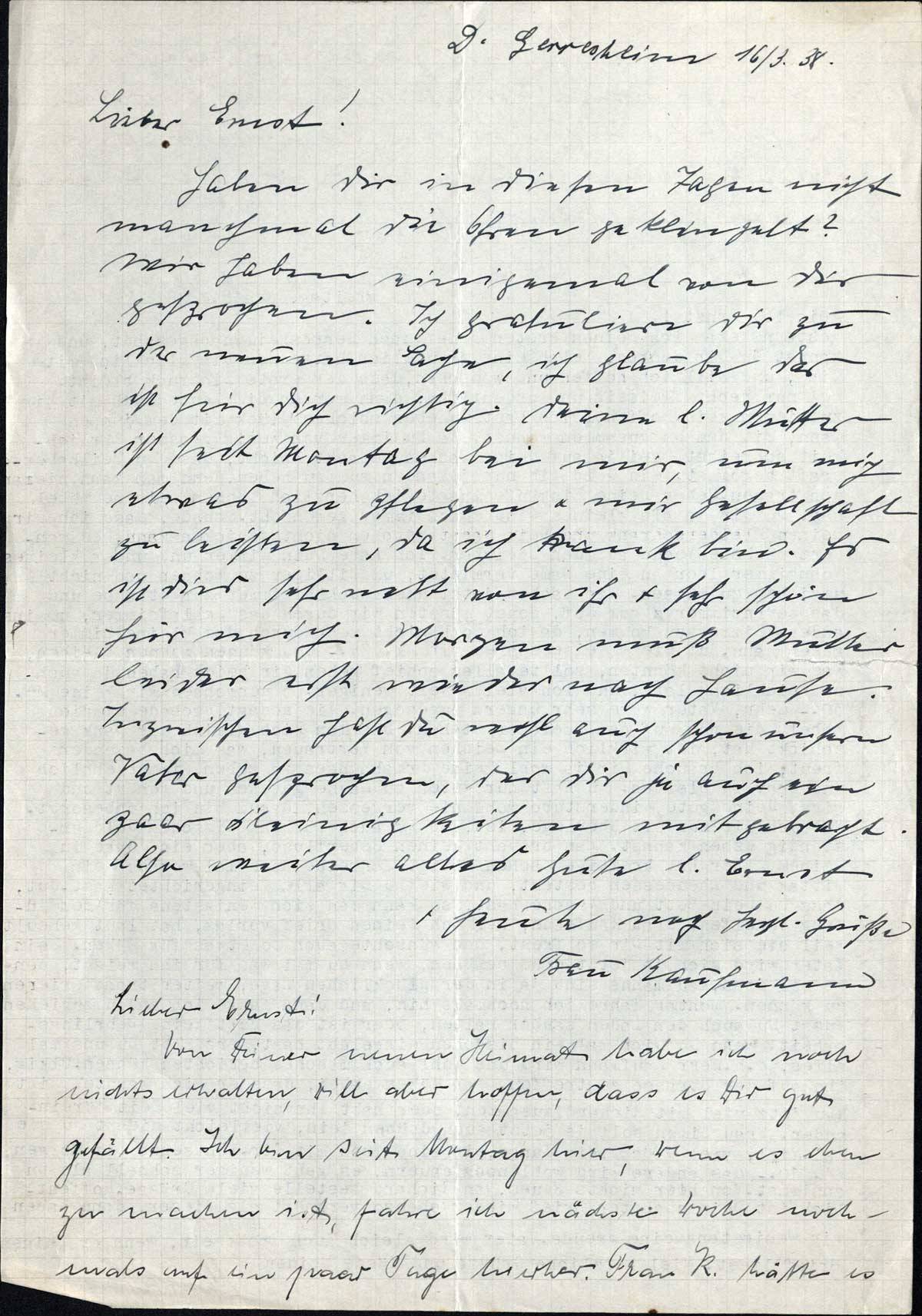 Haben Dir in diesen Tagen nicht manchmal die Ohren geklingelt? Wir haben einigemal von Dir gesprochen. Ich gratuliere Dir zu der neuen Sache, ich glaube das ist für Dich richtig. Deine l. Mutter ist seit Montag bei mir, um mich etwas zu pflegen & mir Gesellschaft zu leisten, da ich krank bin. Es ist dies sehr nett von ihr & sehr schön für mich. Morgen muß Mutter leider erst wieder nach Hause. Inzwischen hast Du wohl auch schon untern Vater gesprochen, der Dir ja auch ein paar Kleinigkeiten mitgebracht. Also weiter alles Gute l. Ernst & heute noch herzl. Grüße