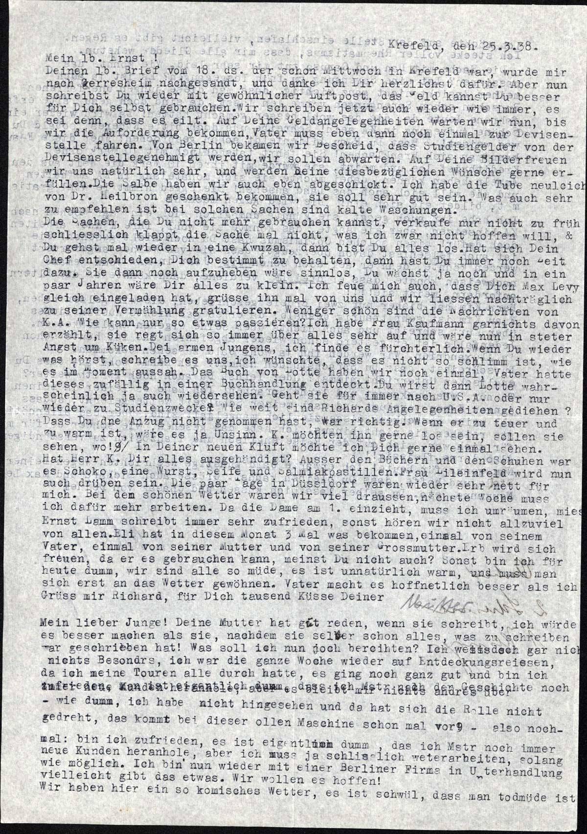 Die Sachen, die Du nicht mehr gebrauchen kannst, verkaufe nur nicht zu früh schliesslich klappt die Sache mal nicht, was ich zwar nicht hoffen will, & Du gehst mal wieder in eine Kwuzah, dann bist Du alles los. Hat sich Dein Chef entschieden, Dich bestimmt zu behalten, dann hast Du immer noch Zeit dazu. Sie dann noch aufzuheben wäre sinnlos, Du wächst ja noch und in ein paar Jahren wäre Dir alles zu klein. Ich freue mich auch, dass Dich Max Levy gleich eingeladen hat, grüsse ihn mal von uns und wir liessen nachträglich zu seiner Vermählung gratulieren. Weniger schön sind die Nachrichten von K.A. Wie kann nur so etwas passieren? Ich habe Frau Kaufmann garnichts davon erzählt, sie regt sich so immer über alles sehr auf und wäre nun in steter Angst um Küken. Die armen Jungens, ich finde es fürchterlich. Wenn Du wieder was hörst, schreibe es uns, ich wünschte, dass es nicht so schlimm ist, wie es im Moment aussah. Das Buch von Lotte haben wir noch einmal, Vater hatte dieses zufällig in einer Buchhandlung entdeckt. Du wirst dann Lotte wahrscheinlich ja auch wiedersehen. Geht sie für immer nach U.S.A. oder nur wieder zu Studienzwecken? Wie weit sind Richards Angelegenheiten gediehen? Dass Du den Anzug nicht genommen hast, war richtig. Wenn er zu teuer und zu warm ist, wäre es ja Unsinn. K. möchte ihn gerne los sein, sollen sie sehen, wo! In Deiner neuen Kluft möchte ich Dich gerne einmal sehen. Hat Herr K. Dir alles ausgehändigt? Ausser den Büchern und den Schuhen war es Schoko, eine Wurst, Seife und Salmiakpastillen. Frau Lilienfeld wird nun auch drüben sein. Die paar Tage in Düsseldorf waren wieder sehr nett für mich. Bei dem schönen Wetter waren wir viel draussen, nächste Woche muss ich dafür mehr arbeiten. Da die Dame am 1. einzieht, muss ich umräumen, mies! Ernst Lamm schreibt immer sehr zufrieden, sonst hören wir nicht allzuviel von allen. Eli hat in diesem Monat 3 Mal was bekommen, einmal von seinem Vater, einmal von seiner Mutter und von seiner Grossmutter. Er wird sich freuen, da er es gebrauchen kann, meinst Du nicht auch? Sonst bin ich für heute dumm, wir sind alle so müde, es ist natürlich warm, und muss man sich erst an das Wetter gewöhnen. Vater macht es hoffentlich besser als ich.
