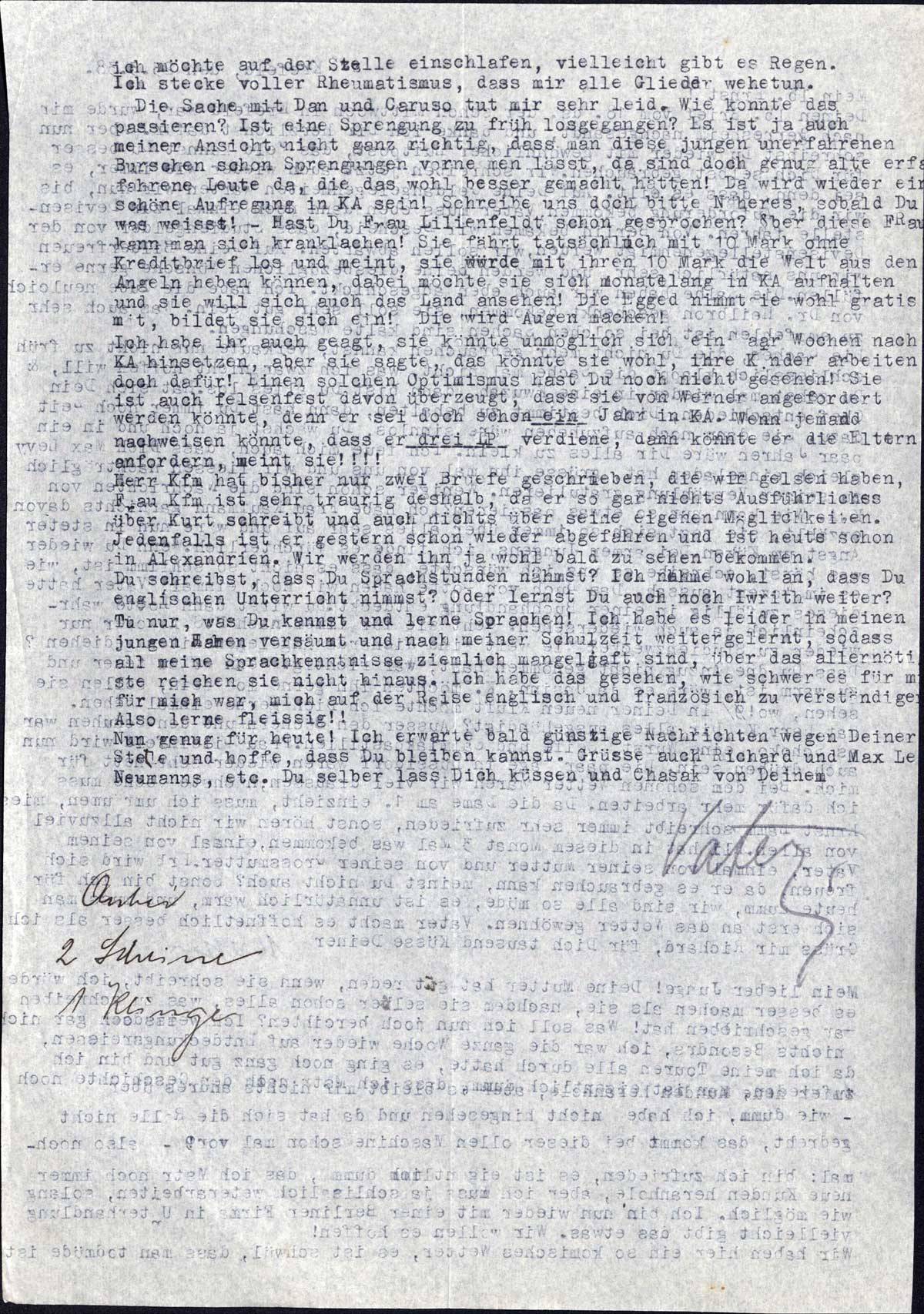 Die Sache mit Dan und Caruso tut mir sehr leid. Wie konnte das passieren? Ist eine Sprengung zu früh losgegangen? Es ist ja auch meiner Ansicht nicht ganz richtig, dass man diese jungen unerfahrenen Burschen schon Sprengungen vornehmen lässt, da sind doch genug alte erfahrene Leute da, die das wohl besser gemacht hätten! Da wird wieder eine schöne Aufregung in KA sein! Schreibe uns doch bitte Näheres, sobald Du was weisst! - Hast Du Frau Lilienfeldt schon gesprochen? Über diese Frau kann man sich kranklachen! Sie fährt tatsächlich mit 10 Mark ohne Kreditbrief los und meint, sie würde mit ihren 10 Mark die Welt aus den Angeln heben können, dabei möchte sie sich monatelang in KA aufhalten und sie will sich auch das Land ansehen! Die Egged nimmt sie wohl gratis mit, bildet sie sich ein! Die wird Augen machen!