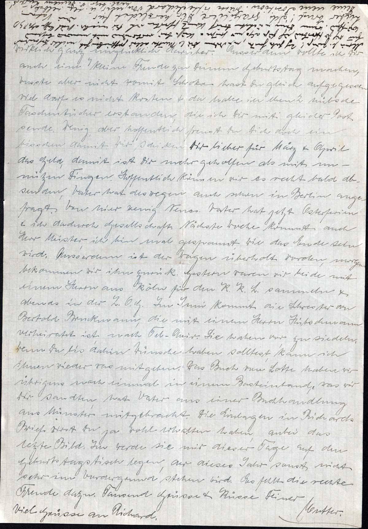 Mein lb. Junge! Ich habe heute, nachdem die l. Mutter alles geschrieben hat, nichts Besonderes für Dich zu schreiben, ich füge also nur Grüße & Küsse bei, verbunden mit meinen besten Wünschen. Wenn Dein nächster Brief kommt, schreibe ich Dir mehr. Viele Küsse also [..]