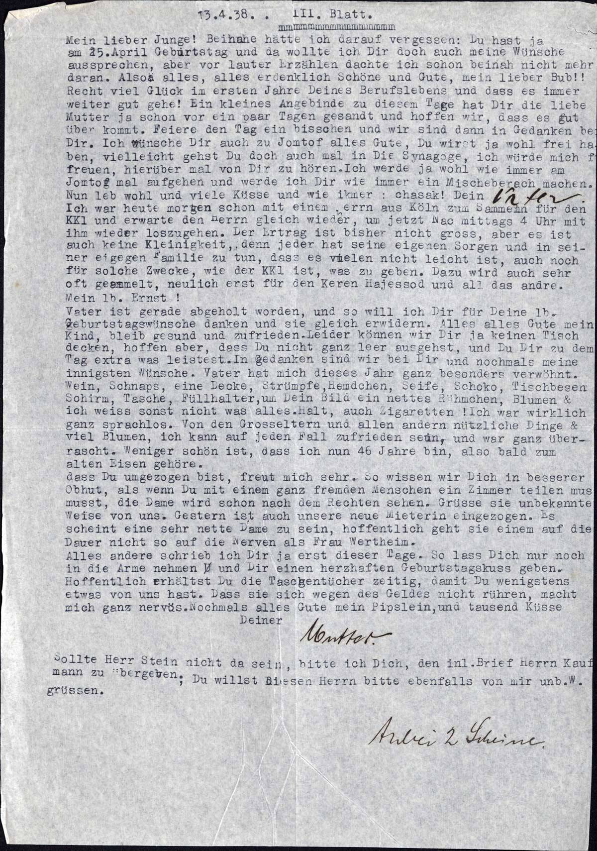 Mein lieber Junge! Beinahe hätte ich darauf vergessen: Du hast ja am 25. April Geburtstag und da wollte ich Dir doch auch meine Wünsche aussprechen, aber vor lauter Erzählen dachte ich schon beinah nicht mehr daran. Also alles, alles erdenklich Schöne und Gute, mein lieber Bub!! Recht viel Glück im ersten Jahre Deines Berufslebens und dass es immer weiter gut gehe! Ein kleines Angebinde zu diesem Tage hat Dir die liebe Mutter ja schon vor ein paar Tagen gesandt und hoffen wir, dass es gut über kommt. Feiere den Tag ein bisschen und wir sind dann in Gedanken bei Dir. Ich wünsche Dir auch zu Jomtof alles Gute, Du wirst ja wohl frei haben, vielleicht gehst Du doch auch mal in die Synagoge, ich würde mich freuen, hierüber mal von Dir zu hören. Ich werde ja wohl wie immer am Jomtof mal aufgehen und werde ich Dir wie immer ein Mischeberach machen. Nun leb wohl und viele Küsse und wie immer: chasak! Dein Vater.