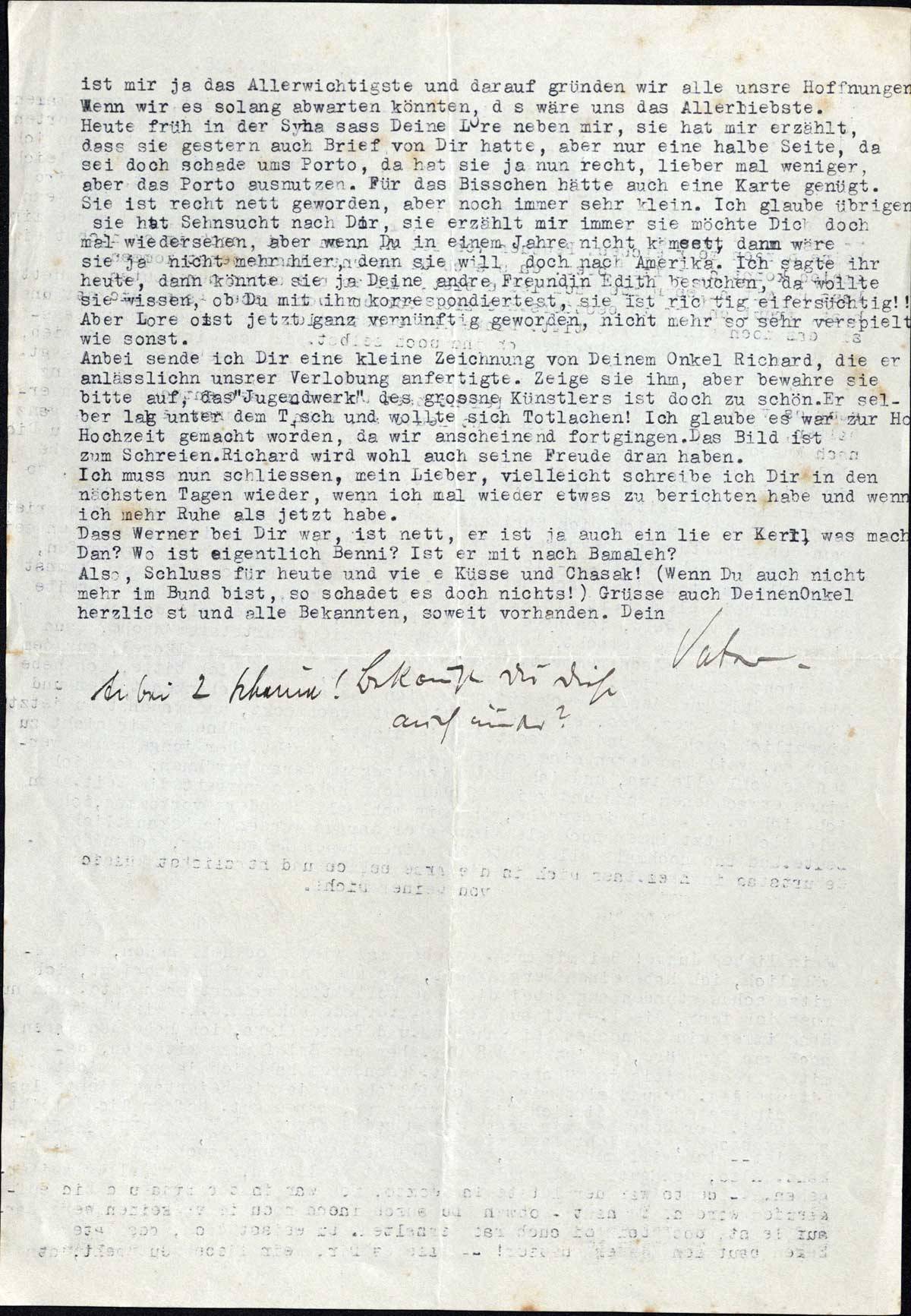 Heute früh in der Syna sass Deine Lore neben mir, sie hat mir erzählt, dass sie gestern auch Brief von Dir hatte, aber nur eine halbe Seite, das sei doch schade ums Porto, da hat sie ja nun recht, lieber mal weniger, aber das Porto ausnutzen. Für das Bisschen hätte auch eine Karte genügt. Sie ist recht nett geworden, aber noch immer sehr klein. Ich glaube übrigens, sie hat Sehnsucht nach Dir, sie erzählt mir immer sie möchte Dich doch mal wiedersehen, aber wenn Du in einem Jahre nicht kommst, dann wäre sie ja nicht mehr hier, denn sie will doch nach Amerika. Ich sagte ihr heute, dann könnte sie ja Deine andre Freundin Edith besuchen, da wollte sie wissen, ob Du mit ihr korrespondiertest, sie ist richtig eifersüchtig!! Aber Lore ist jetzt ganz vernünftig geworden, nicht mehr so sehr verspielt wie sonst.