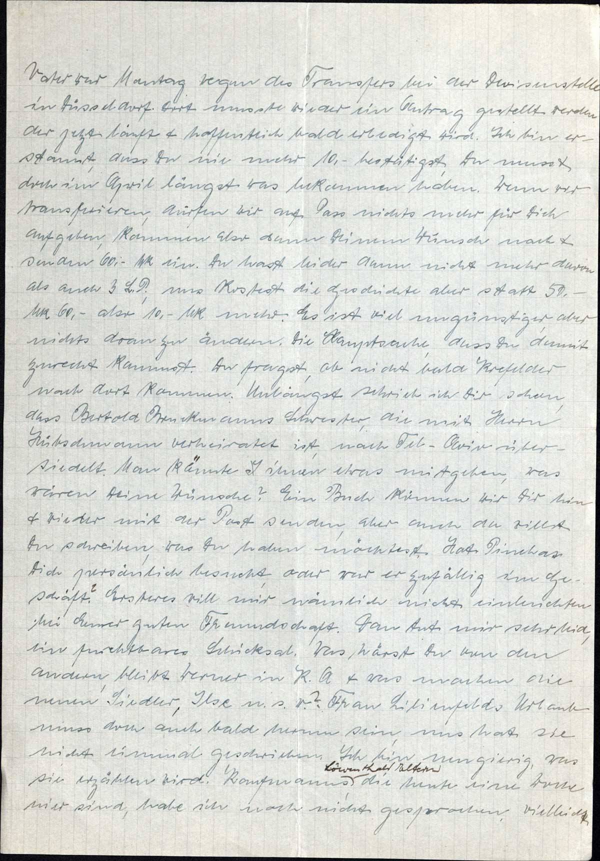 Vater war Montag wegen des Transfers bei der Devisenstelle in Düsseldorf. Dort musste wieder ein Antrag gestellt werden, der jetzt läuft & hoffentlich bald erledigt wird. Ich bin erstaunt, dass Du nie mehr 10,- bestätigst, Du musst doch im April längst was bekommen haben. Wenn wir transferieren, dürfen wir auf Pass nichts mehr für Dich aufgeben, kommen also dann Deinem Wunsch nach & senden 60,- Mk ein. Du hast leider dann nicht mehr davon als auch 3 L.P., uns kostet die Geschichte aber statt 50,- Mk 60,- also 10,- Mk mehr. Es ist viel ungünstiger, aber nichts dran zu ändern. Die Hauptsache, dass Du damit zurecht kommst. Du fragst, ob nicht bald Krefelder nach dort kommen. Unlängst schrieb ich Dir schon, dass Bertold Bruckmanns Schwester, die mit Herrn Hübschmann verheiratet ist, nach Tel-Aviv übersiedelt. Man könnte ihnen etwas mitgeben, was wären Deine Wünsche? Ein Buch können wir Dir hin & wieder mit der Post senden, aber auch da willst zu schreiben, was Du haben möchtest. Hat Pinchas Dich persönlich besucht, oder war er zufällig im Geschäft? Ersteres will mir nämlich nicht einleuchten bei Eurer guten Freundschaft. Dass tut mir sehr leid, ein furchtbares Schicksal. Was hörst Du von den andern, bleibt Werner in K.A. & was machen die neuen Siedler, Ilse u.s.w.? Frau Lilienfelds Urlaub muss doch auch bald herum sein, uns hat sie nicht einmal geschrieben. Ich bin neugierig, was sie erzählen wird. Kaufmanns, Löwenthals Eltern, die heute eine Woche hier sind, habe ich noch nicht gesprochen, vielleicht