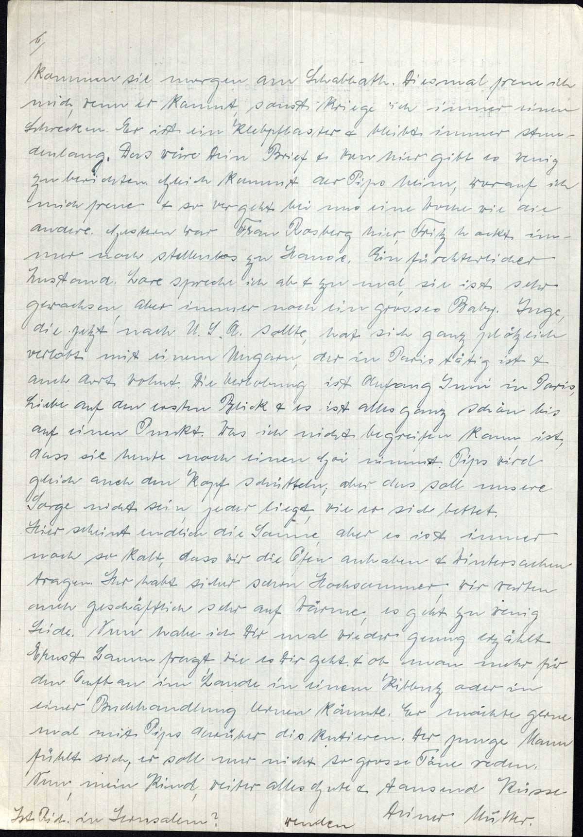 kommen sie morgen am Schabbath. Diesmal freue ich mich, wenn er kommt, sonst kriege ich immer einen Schrecken. Er ist ein Klebpflaster & bleibt immer stundenlang. Das wäre Dein Brief & von hier gibt es wenig zu berichten. Gleich kommt der Pips heim, worauf ich mich freue & so vergeht bei uns eine Woche wie die andere. Gestern war Frau Rosberg hier, Fritz hockt immer noch stellenlos zu Hause. Ein fürchterlicher Zustand. Lore spreche ich ab & zu mal, sie ist sehr gewachsen, aber immer noch ein grosses Baby. Inge, die jetzt nach U.S.A. sollte, hat sich ganz plötzlich verlobt mit einem Ungarn, der in Paris tätig ist & auch dort wohnt. Die Verlobung ist Anfang Juni in Paris, Liebe auf den ersten Blick & es ist alles ganz schön bis auf einen Punkt. Was ich nicht begreifen kann, ist, dass sie heute noch einen Goi nimmt. Pips wird gleich auch den Kopf schütteln, aber das soll unsere Sorge nicht sein, jeder liegt, wie er sich bettet.