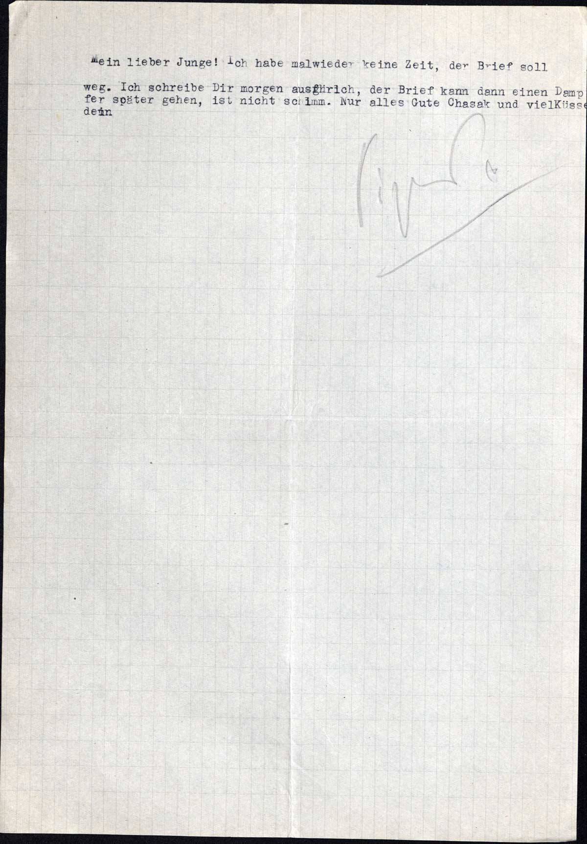 Hier scheint endlich die Sonne, aber es ist immer noch so kalt, dass wir die Öfen anhaben & Wintersachen tragen. Ihr habt sicher schon Hochsommer; wir warten auch geschäftlich sehr auf Wärme, es gut zu wenig Seide. Nun habe ich Dir mal wieder genug erzählt. Ernst Lamm fragt, wie es Dir geht & ob man mehr für den Aufbau im Lande in einem Kibbutz oder in einer Buchhandlung lernen könnte. Er möchte gerne mal mit Pips darüber diskutieren. Der junge Mann fühlt sich, er soll nur nicht so grosse Töne reden.