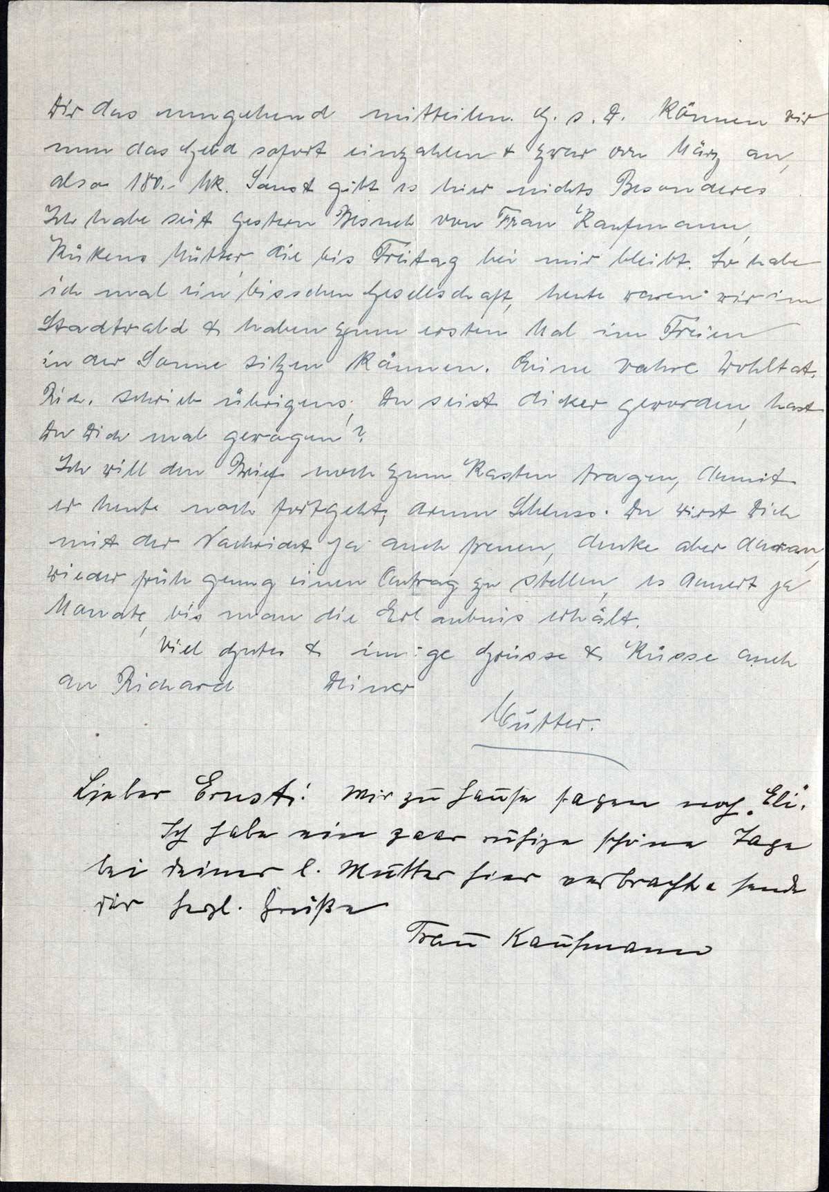 Dir das umgehend mitteilen. G. s. D. können wir nun das Geld sofort einzahlen & zwar von März an, also 180.- Mk. Sonst gibt es hier nichts Besonderes. Ich habe seit gestern Besuch von Frau Kaufmann, Kükens Mutter, die bis Freitag bei mir bleibt. So habe ich mal ein bisschen Gesellschaft, heute waren wir im Stadtwald & haben zum ersten Mal im Freien in der Sonne sitzen können. Eine wahre Wohltat. Rich. schreib übrigens, Du seiest dicker geworden, hast Du Dich mal gewogen?