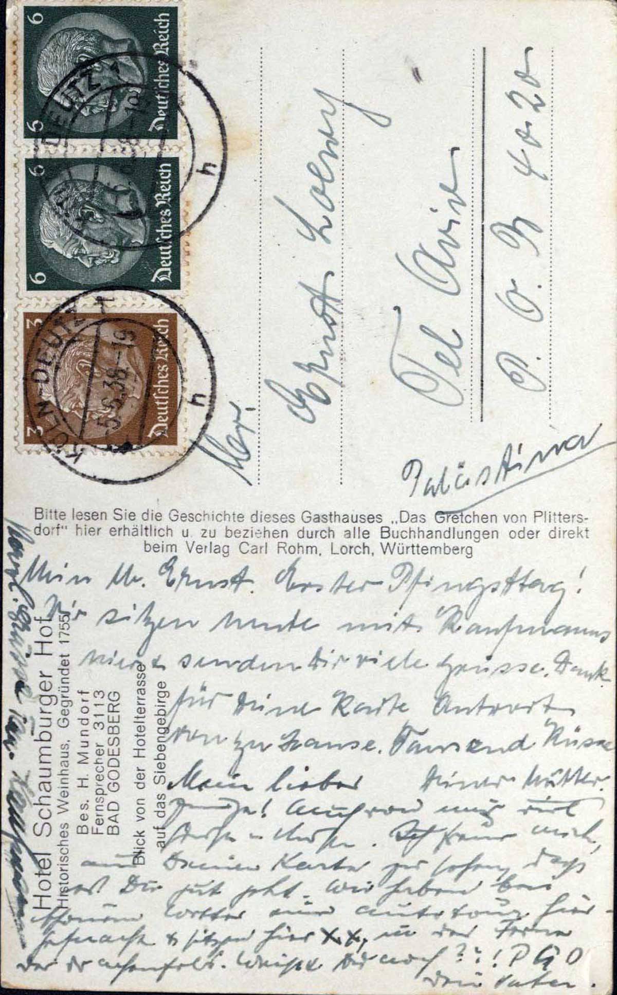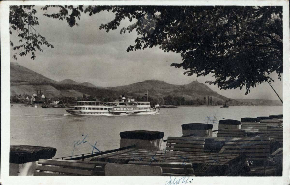 Mein lieber Junge! Auch von mir viel Grüße u. Küsse. Ich freue mich, auch Deine Karte zu sehen, daß es Dir gut geht. Wir haben bei schönem Wetter eine Autotour hier gemacht & sitzen hier xx, in der Ferne der Drachenfels. Weißt Du noch??! [..]