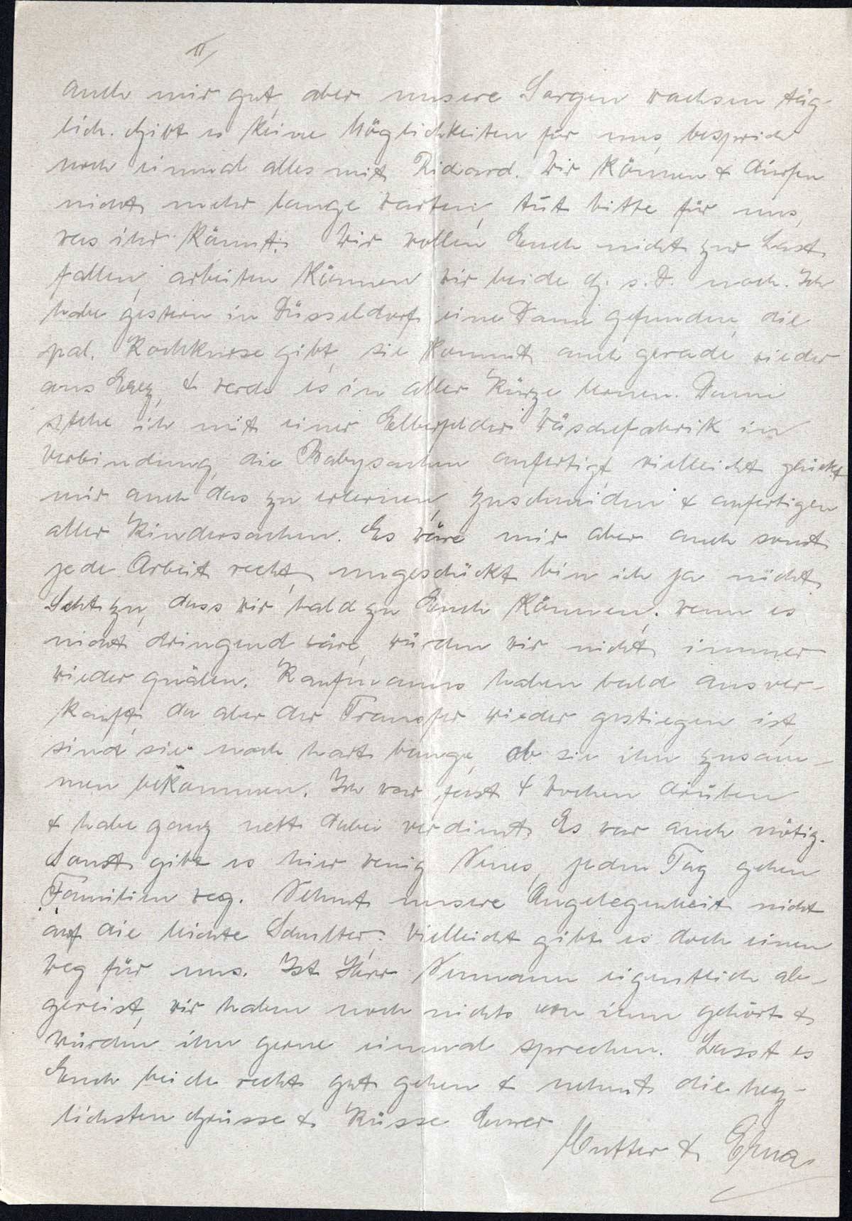 ist es mit einer Freundin, hat Edith noch keine Nachfolgerin bekommen? Mütter müssen, resp. wollen doch immer alles wissen. Ich habe auch schon mehrmals nach einem Küchenzettel von Dir gefragt, aber solche Dinge beantwortest Du nie. Hast Du eigentlich Deine Arbeitssachen verkauft oder behältst Du sie doch besser. Und nimmst Du keinen engl. Unterricht? Gehst Du schwimmen oder turnen, ich hätte hundert Dinge zu fragen. Es ist ein Jammer, dass ich nicht mal kommen kann & nach dem Rechten sehe, ich darf garnicht daran denken, dass es nicht sein kann. Aber der Tag wird auch kommen, wo wir uns alle wieder in den Armen halten, vielleicht ist er näher, als wir denken. Hoffentlich! Was macht Richard, ich möchte gerne mal wieder ausführlich von ihnen hören, von seinem Arbeiten & seinem persönlichen Ergehen, Pips ist imm unterwegs, aber das Geschäft ist ganz miserabel & wird auch für uns immer weniger. Wenn man nur einen Ausweg sähe, aber so tappst man im Dunkeln & weiss nicht, was wird. Nun will ich bis morgen schliessen, in der Hoffnung, bis dahin Gutes von Dir & Richard zu hören. Indessen lass Dich umarmen & küssen von Deiner Mutter.