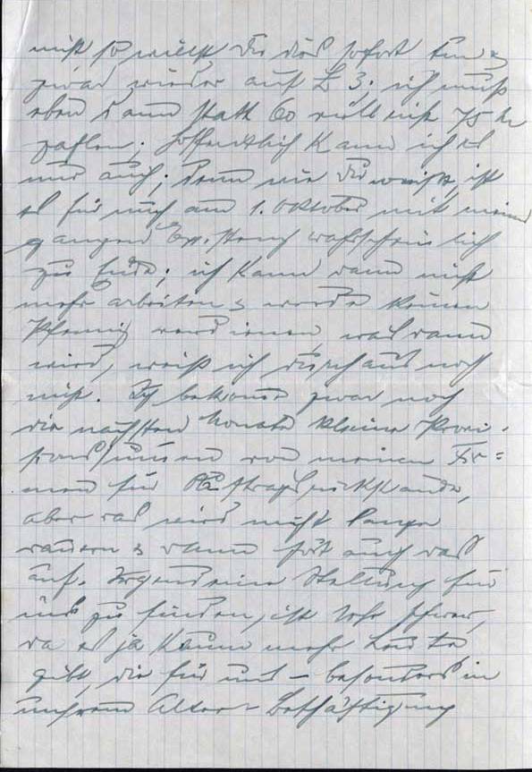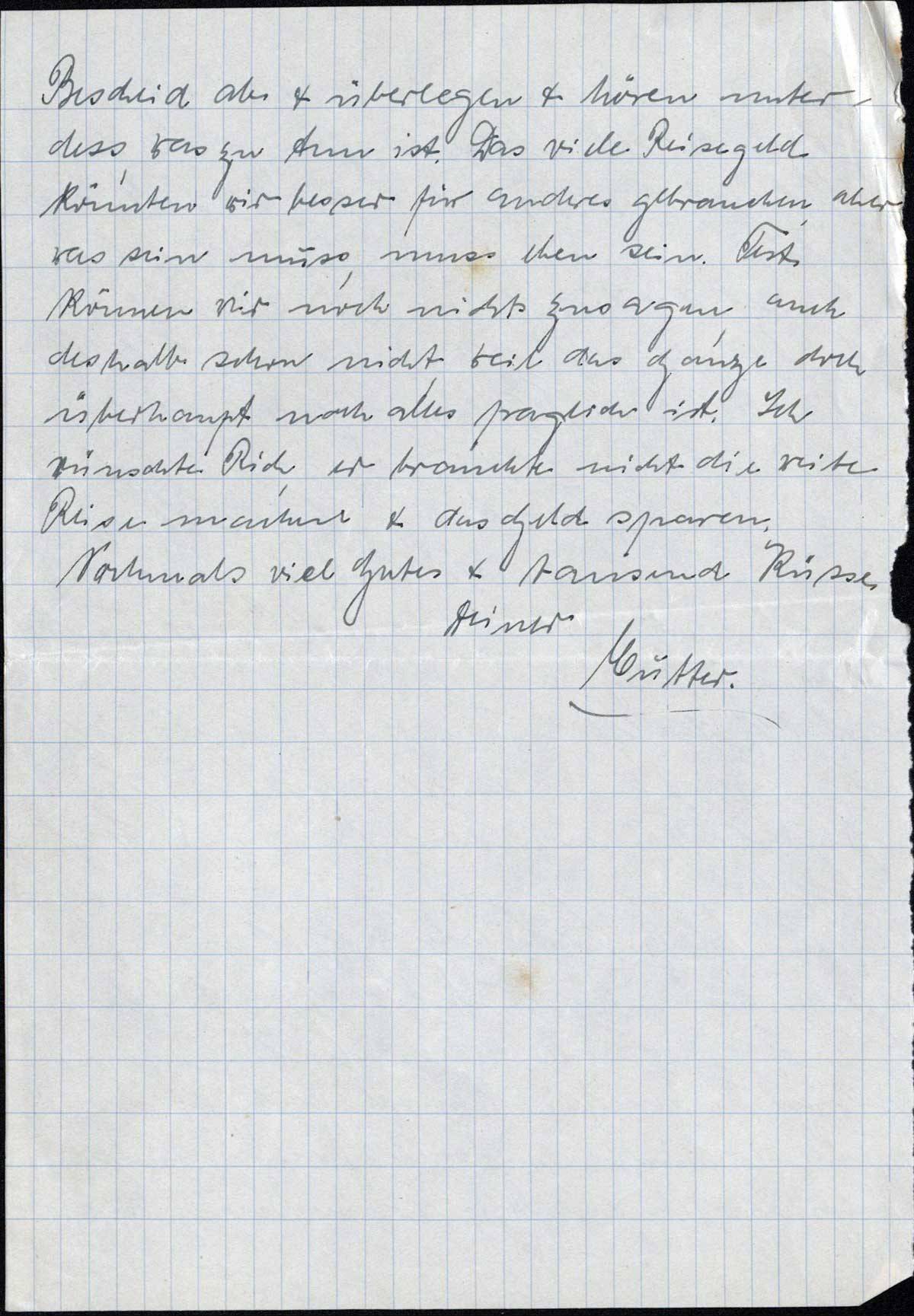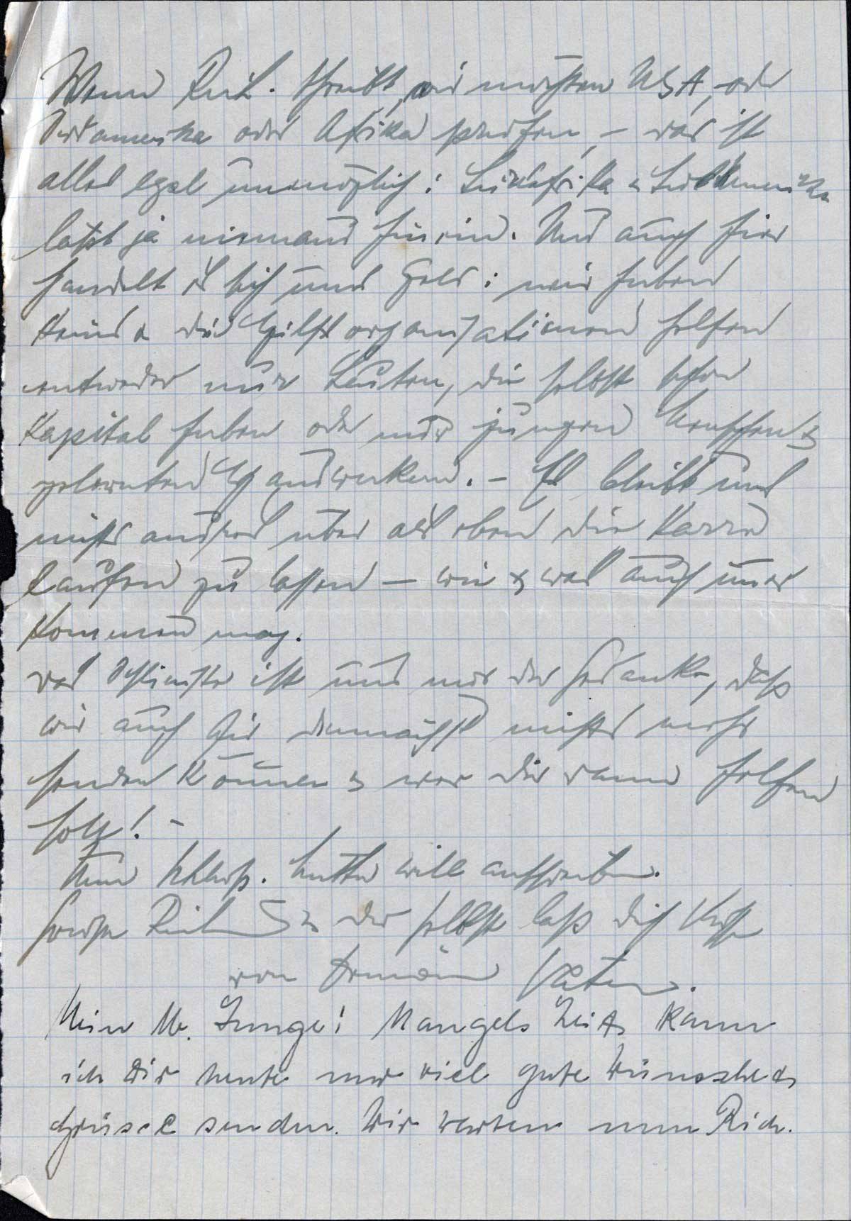 Nun zu dem Plan des Treffens mit Richard. Ich bin mir nicht klar, ob es rein technisch möglich ist ihn in P. zu treffen. [..] würden wir es eben möglich machen müssen, obwohl wir die 100 Mark, die es kostet - die Reise ist weit & kostet allerlei - nicht über haben, aber es müßte eben gemacht werden; im Prinzip sind wir einverstanden & würde die l. Mutter hinfahren; anders ist die rein technische Frage: ob es geht. Wir fragen mal bei Tante Hedwig in [..] an, wie es dort geht; von da ists ja sonst am einfachsten, weil an den verschiedenen Orten ja Verwandte von mir wohnen, wo Mutter immer wohnen könnte, es kostete dann nicht soviel & wir müssen doch mit jedem Pfennig rechnen.